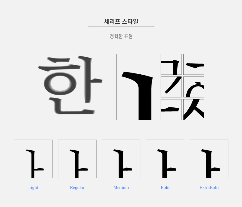 디테일이 살아있는 각이 진 세리프는 서체의 완성도를 더욱 높여줍니다. 정확하고 세밀한 각과 유려하게 흐르는 곡선이 아름다운 조화를 이루는 세리프 디자인입니다.