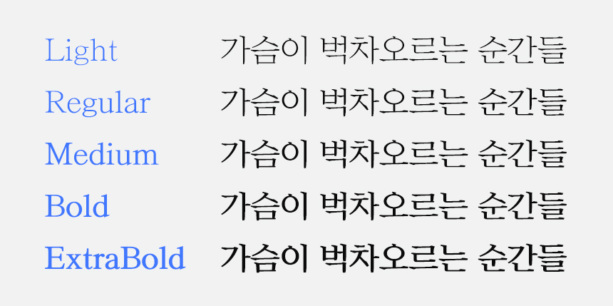 3종 웨이트를 갖고 있던 신문명조 서체가 방송 자막이나 타이틀로 자주 사용되는 점을 고려하여 Bold와 ExtraBold 2종을 추가로 파생했어요. 다양한 분야에서의 쓰임이 점점 높아지는 만큼 그에 맞는 추가 제작을 진행했습니다.
