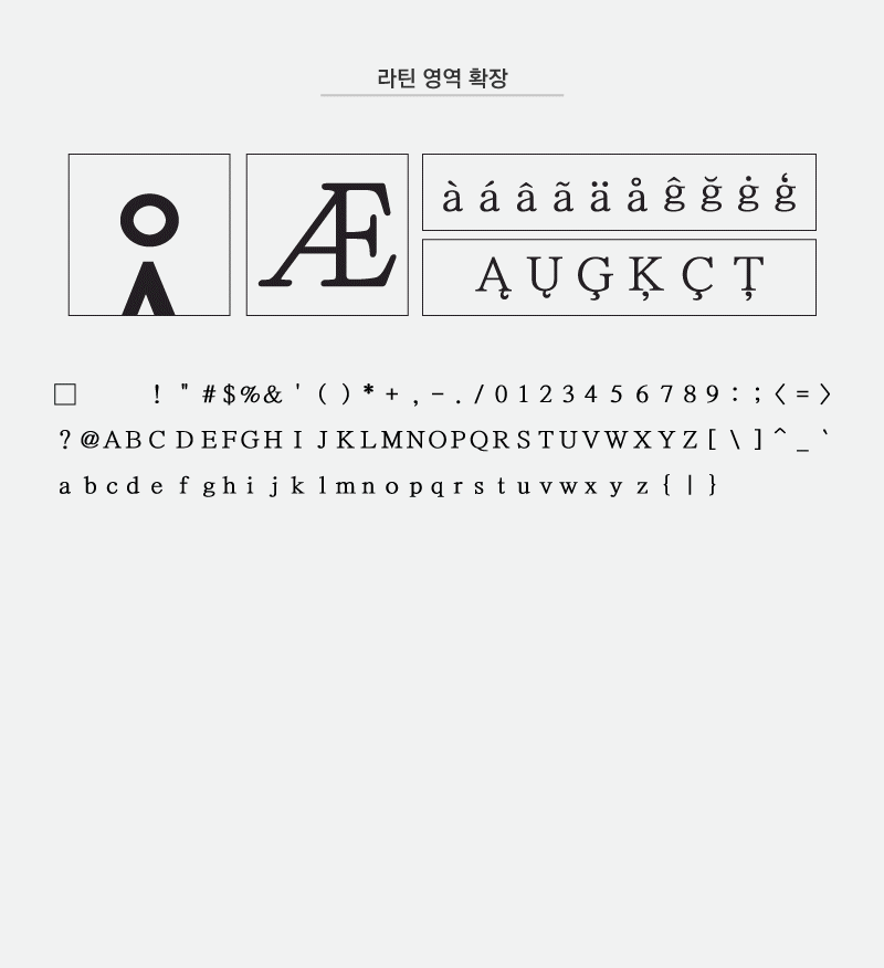 Rix신문명조SE 폰트에서는 라틴문자 영역을 확장했습니다. 더 다양하고 자유로운 표현이 가능해져 여러 분야에서 사용성이 높아질 것으로 기대됩니다.
