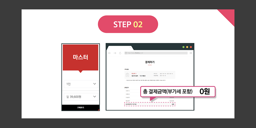 2. 구매하고 싶은 월 결제 상품 선택 후 구매하기 버튼 클릭 -> 결제 금액 0원 확인 후 결제하기 버튼을 눌러주세요.