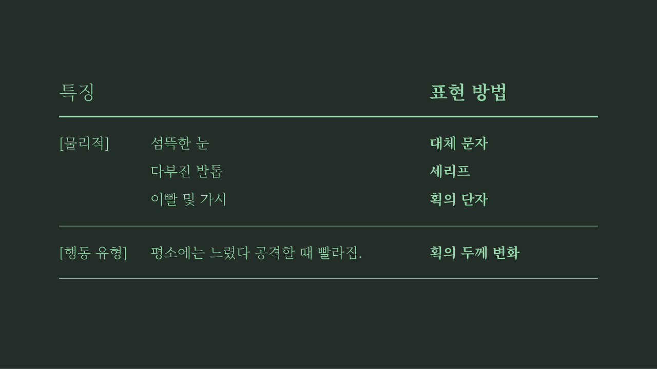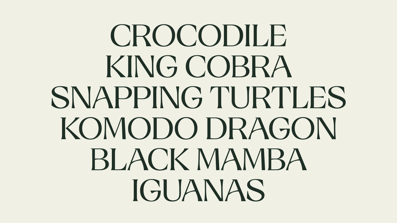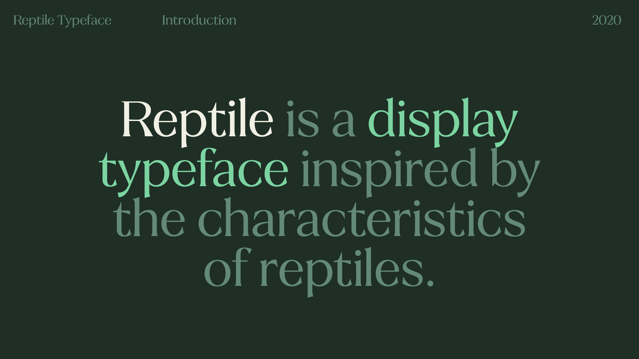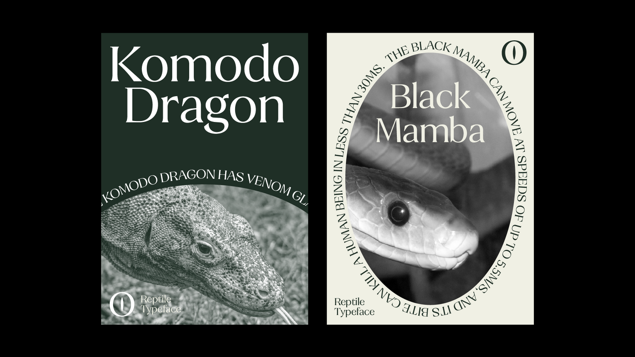 이전 글에서도 반복적으로 서체는 디자이너가 표현하고자 하는 뉘앙스를 전달하는 시각적인 언어라고 표현한 적이 있습니다. 하지만 이번 프로젝트는 서체가 디자인의 성격을 표현하기 위한 수단이 아니라, 어떤 것에서 영감을 받고, 그 자체를 표현해보고 싶다는 취지에서 시작했습니다. 그렇게 고르게 된 주제가 파충류였고요! 파충류를 그렇게 좋아하지는 않지만... 다른 동물들보다 재밌는 특징들이 많다고 생각했습니다 :)