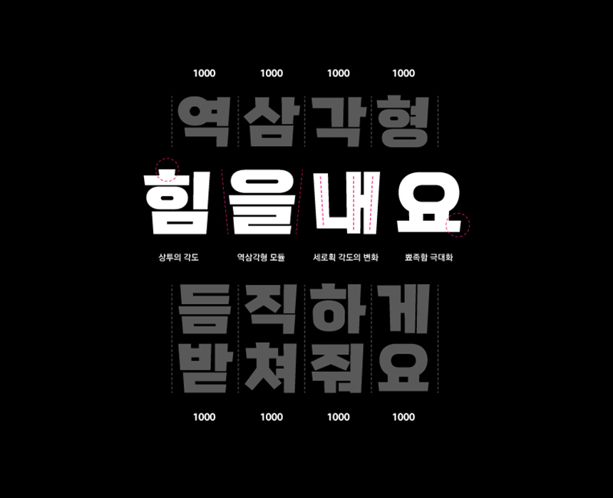 이번 힘을내요 서체는 역삼각형 모듈이 가장 큰 포인트며, 그 부분을 더 확실하게 주기 위해 좌우 가로획 끝의 사선을 더 과하게 만들었습니다. 이 부분을 후반 작업으로 하나하나 만지는 것이 힘들고 시간이 더 걸렸지만 완성 후 처음에 생각했던 느낌이 더 잘 살려진 것 같아 좋았습니다.