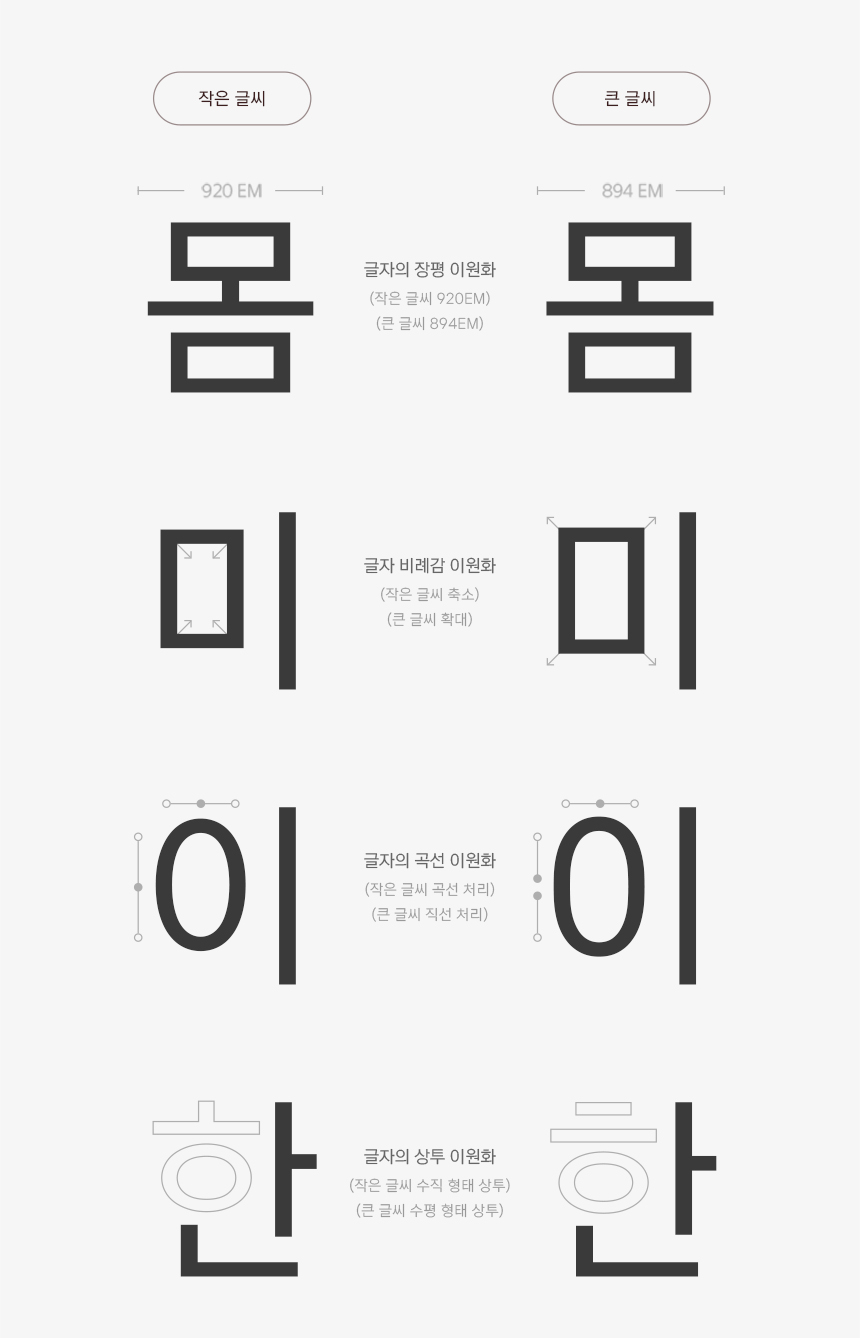 글씨의 크기에 따라 적절한 글자의 장평(너비), 비례감, 이응 꼴의 곡선 처리, 상투의 형태 디자인을 각각 다르게 적용했습니다. 사용 환경에 따른 글자의 이원화 작업을 통해 화면에서의 가독성을 높였습니다.