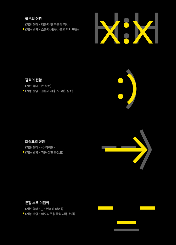 카카오 전용서체인 만큼 이모티콘 사용을 용이하게 하기 위해 특별히 OpenType Feature 기능을 추가했습니다. 이모티콘이나 심볼로 자주 사용하는 콜론이나 괄호, 문장 부호 등에 디테일한 변화를 적용함으로써 사용 환경에 따라 편리하게, 보다 자연스럽게 사용할 수 있도록 했습니다.