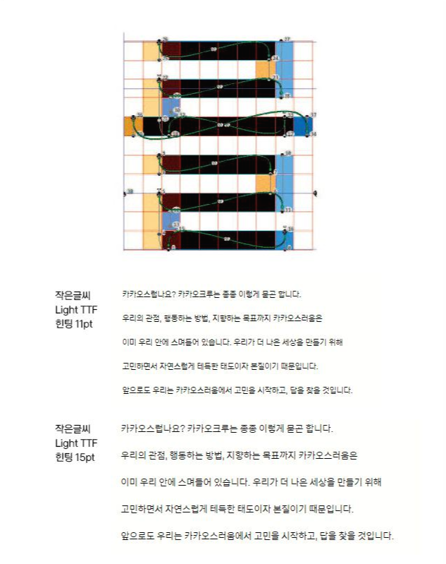 또한 웹폰트로 쓰이거나 작은 글씨로 쓰였을 때 좀 더 깔끔하게 보이고, 획이 많은 글자에서 뭉침 해소 등을 통해 가독성을 높이는 일환으로 힌팅 작업을 진행했습니다. 이 작업을 통해 획의 끊어짐이나 일정치 않은 굵기, 불분명한 윤곽선 등의 문제를 보완할 수 있습니다.