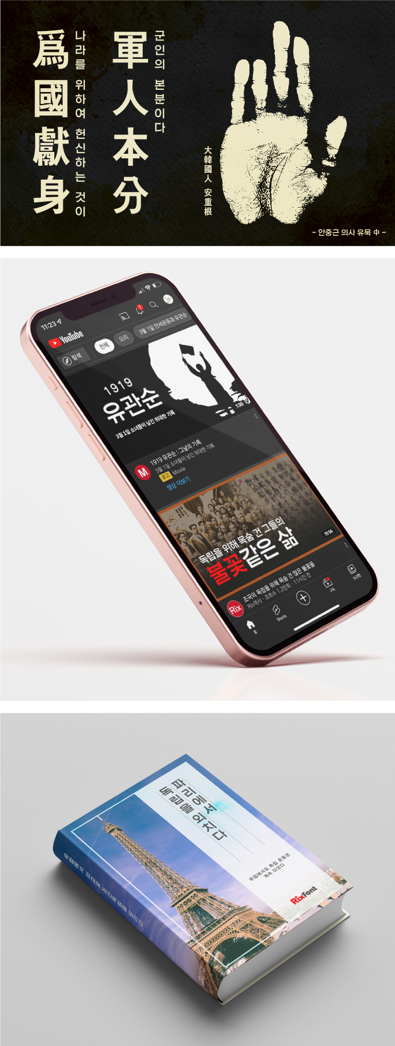 Rix독립고딕SE는 꽉 찬 네모꼴에 두껍고 단단한 획, 절제된 표현과 간결한 직선의 형태에서 모던함이 돋보이며, Rix독립돋움SE는 손글씨의 획을 적용한 자소 디자인과 꽉 찬 골격의 넓은 폭으로 좀 더 예스러운 느낌이 강조되었습니다.