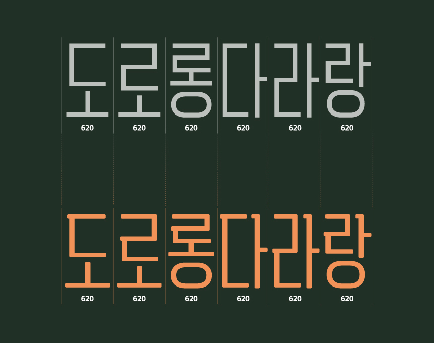 도로롱 시리즈의 좁은 폭은 기존의 서체와는 다른 독특한 분위기를 자아냅니다. 폭이 좁지만 위아래로 넓은 공간감과 자소 간격, 그 안에서 쭉쭉 뻗은 직선 획들이 시원함을 느끼게 합니다.