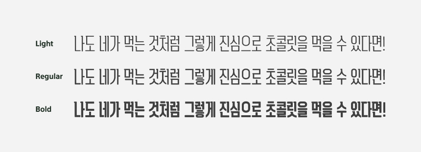 Light, Regular, Bold 각 두께별로 획의 마무리에 적당한 굴림을 주어 보다 여유롭고 유연한 느낌을 줍니다. 또한 자소들의 널찍한 공간감과 전체적으로 디자인에 적절한 간격 설정으로 폭이 좁아도 시원한 인상을 갖고 있습니다.