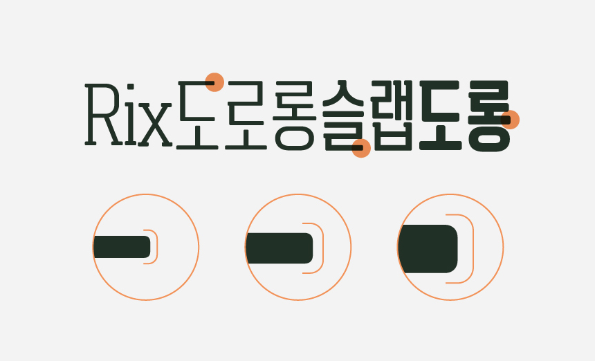 슬랩 세리프는 위와 같이 글자와 기호를 이루는 획의 일부 끝이 돌출된 세리프가 굵은 사각 형태의 모습을 보이는 서체 스타일입니다. 기존의 슬랩 세리프 서체들과 다르게 Rix도로롱슬랩은 각이 진 부분을 부드럽게 굴려 제작되었습니다.