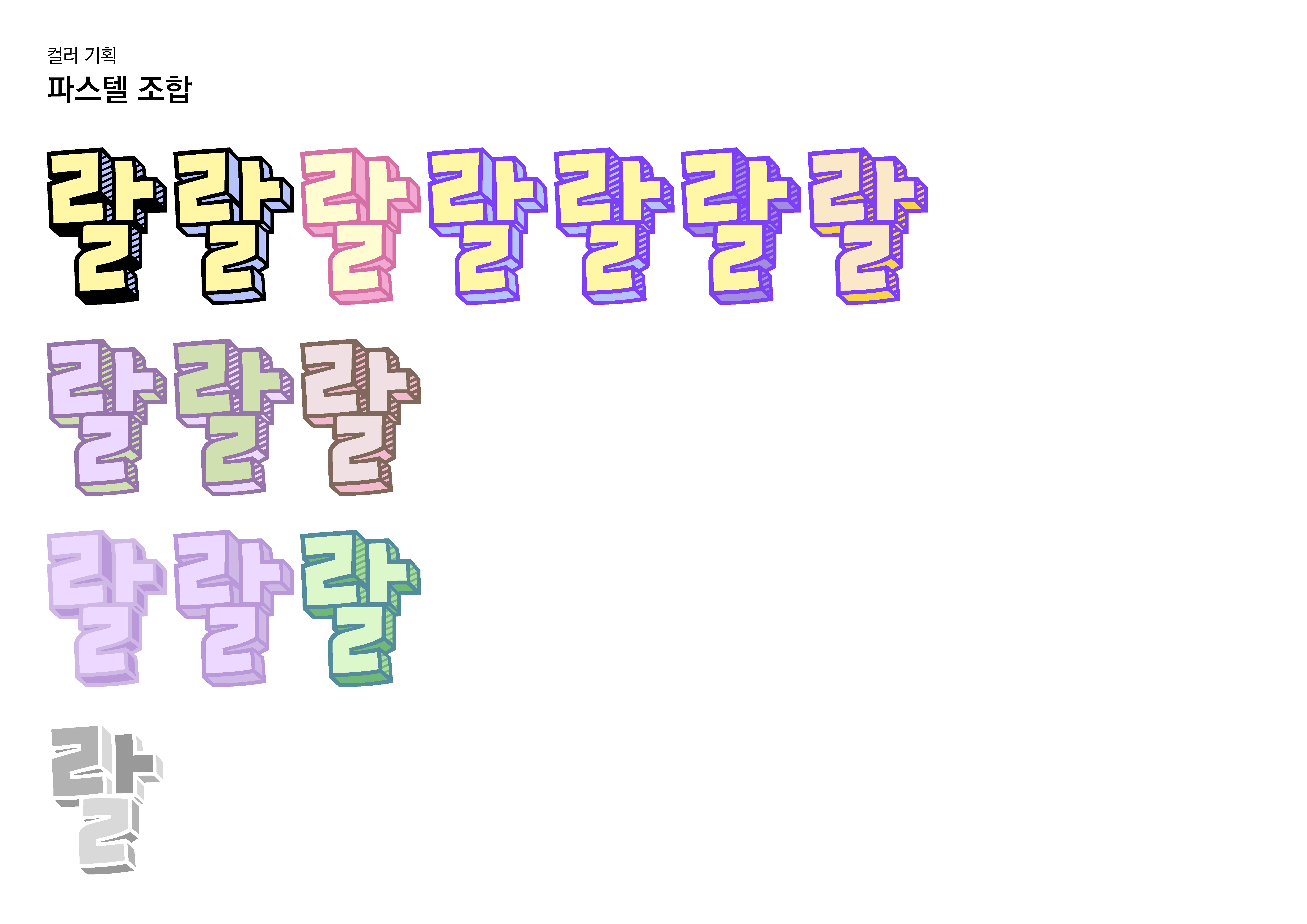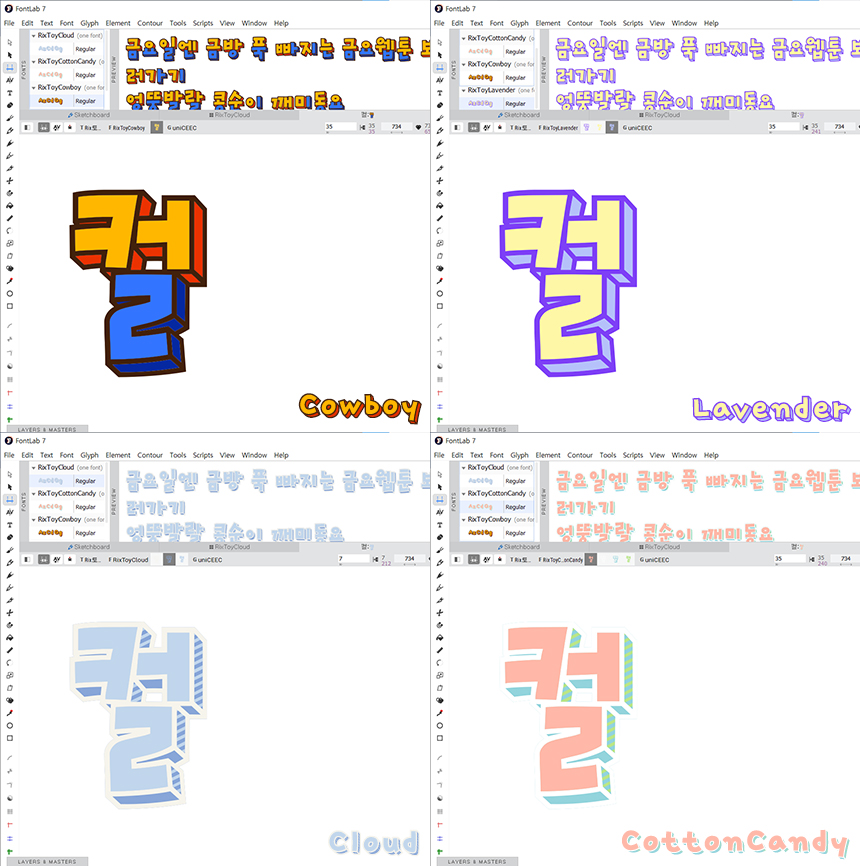 컬러를 기획할 때 토이스토리 폰트의 특성인 레이어를 3중~4중 결합하여 보다 적극적인 그래픽 조합을 시도했고, 여러 컬러 폰트들의 사례를 찾아보며 여태 없던 방식의 조합을 구상하게 되었습니다. 색감의 조합에 따라서 사용성 또한 다양해지는 효과를 기대하며 제작했습니다.