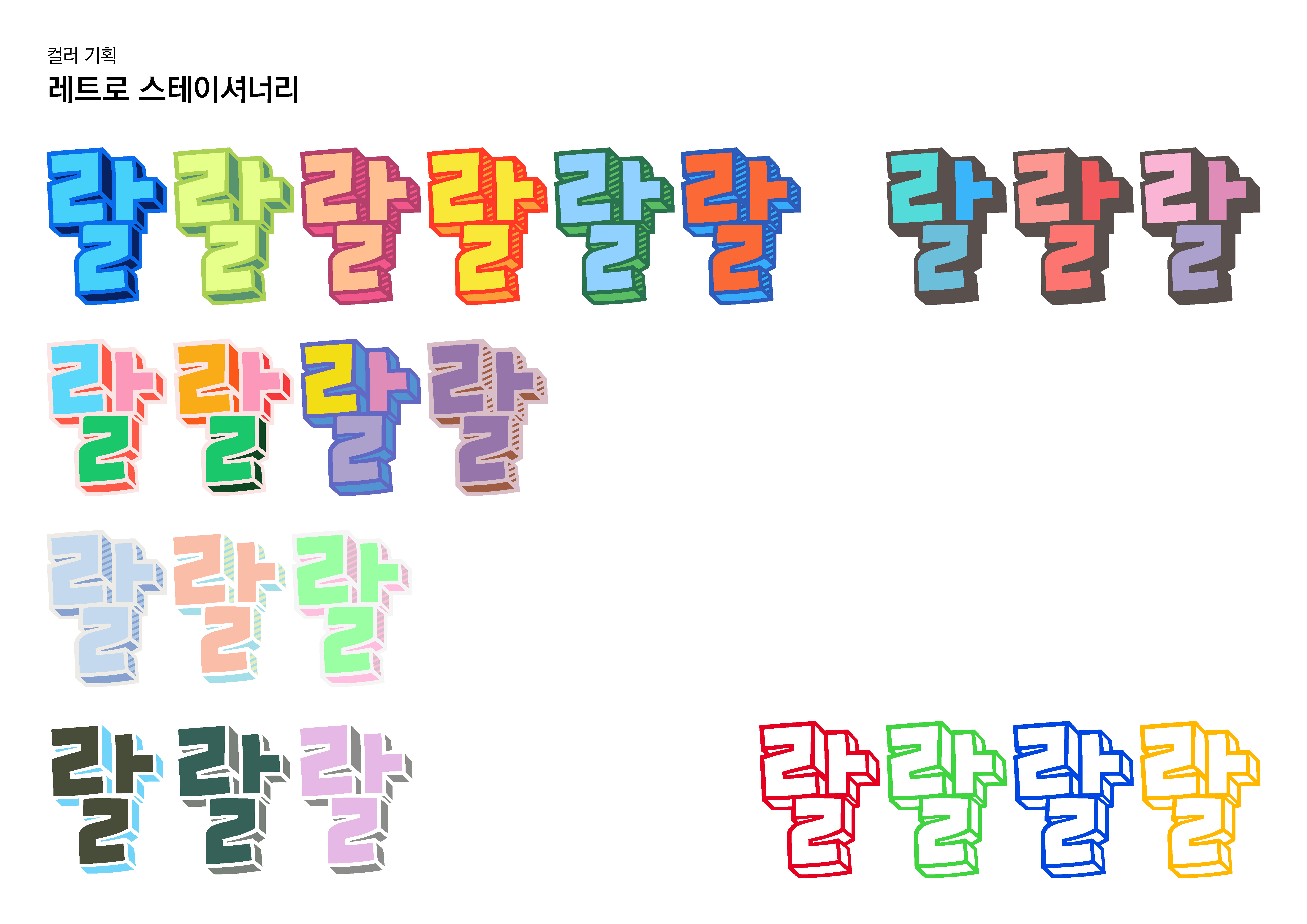 Rix토이스토리의 가장 큰 매력은 컬러폰트답게 역시 색감이라고 생각합니다! 컬러를 정할 때 많이 고민했는데요. 토이스토리의 주제에서 파생한 알록달록한 장난감 색채, 그 장난감들이 시간이 지나 빛이 바랜 듯한 빈티지한 색감, 활용성이 좋은 파스텔 색감 이렇게 크게 3가지로 패밀리를 꾸려보았습니다.