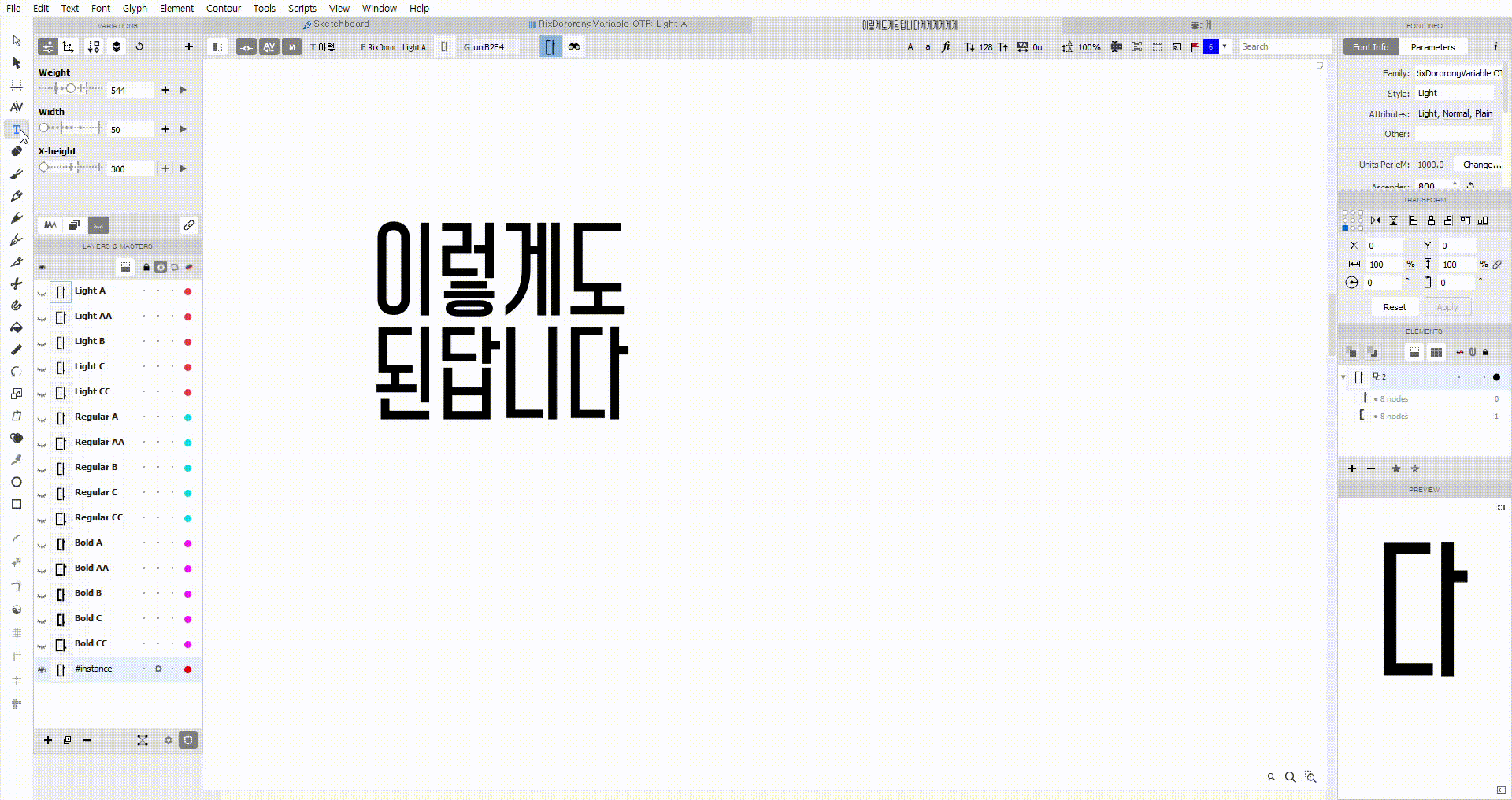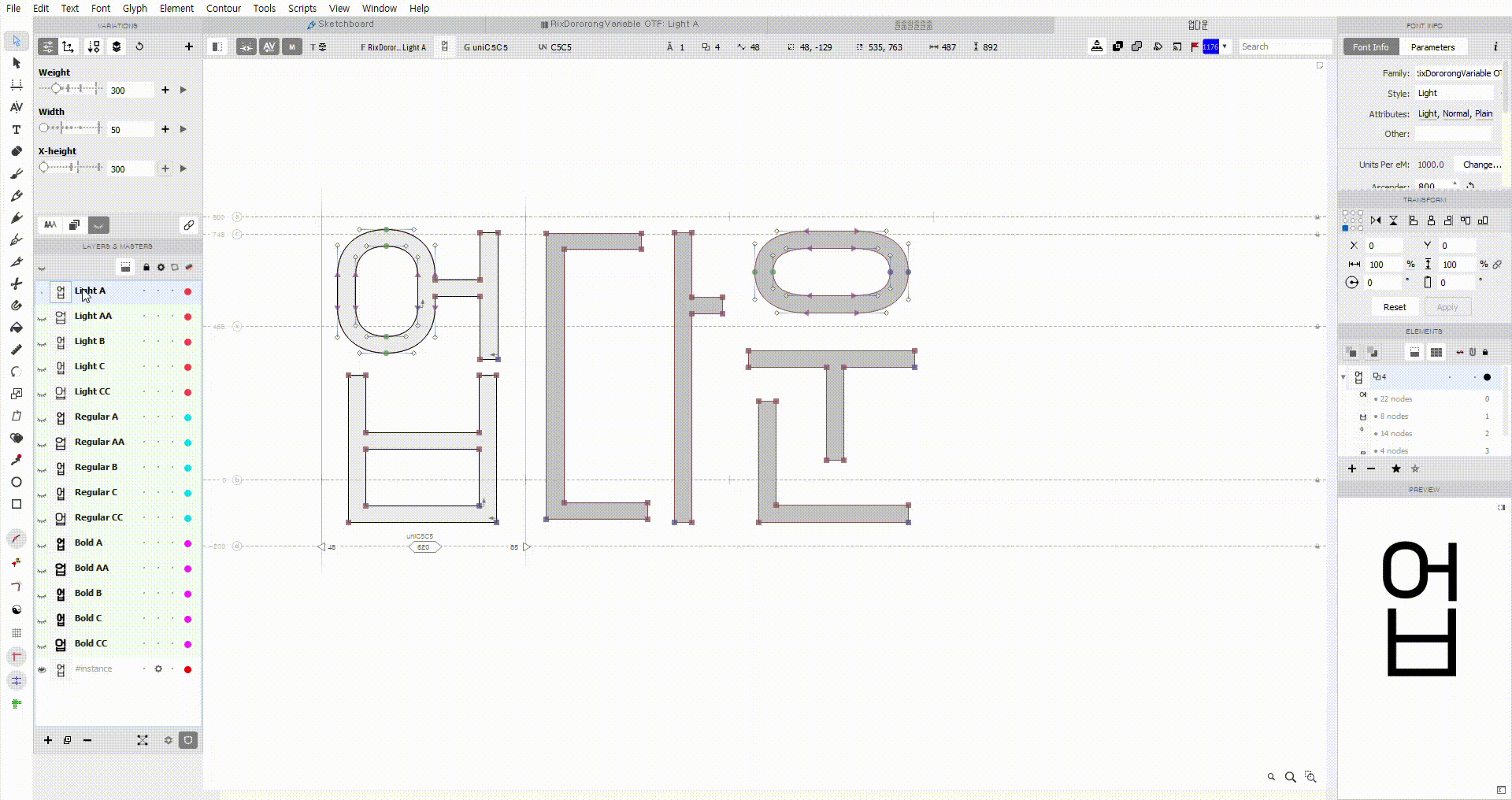 워낙 제작도 오래 걸리고 어려운 배리어블 서체라 우여곡절도 있었을 것 같아요. 비하인드를 살짝 말씀해 주신다면? 배리어블 폰트를 만들려면 원도 상에서 점의 속성이나 개수가 모두 동일해야 하고, 축의 양 극단 형태를 모두 작업해야 하는데요, 아무래도 도로롱배리어블은 축의 속성이 굵기, 자폭, 무게중심(UpDown)으로 세 개다 보니 작업할 양이 굉장히 정말 정말 많아지더라고요..? 울면서 작업했습니다. (웃음)
