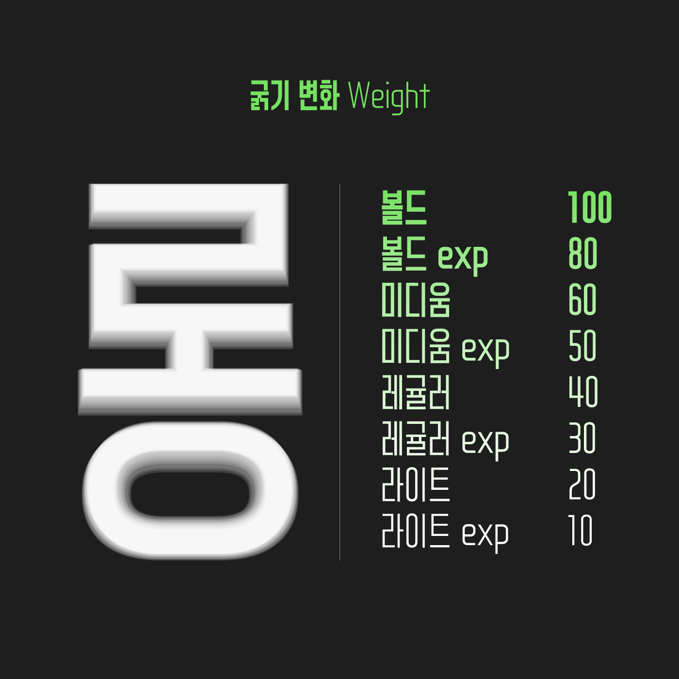 글자의 두께는 Light부터 Bold까지 무수히 많은 굵기를 세밀하게 표현할 수 있습니다. 너비 또한 아주 좁은 형태부터 넓게 조절할 수 있어 글자의 스타일와 분위기에 다양한 변주를 줄 수 있습니다.