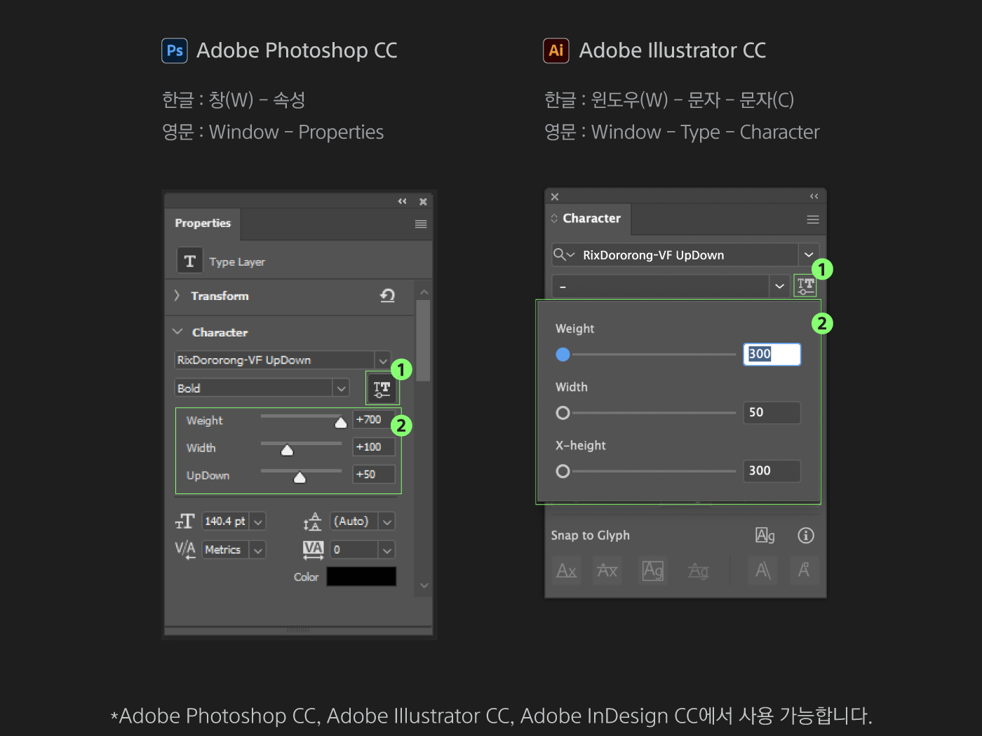 *Opentype 기능을 지원하는 어도비 프로그램(Adobe CC)에서 사용 가능하며, 확장자는 TTF로 제공되어 RixFont클라우드 TTF 탭에서만 활성화가 가능합니다.