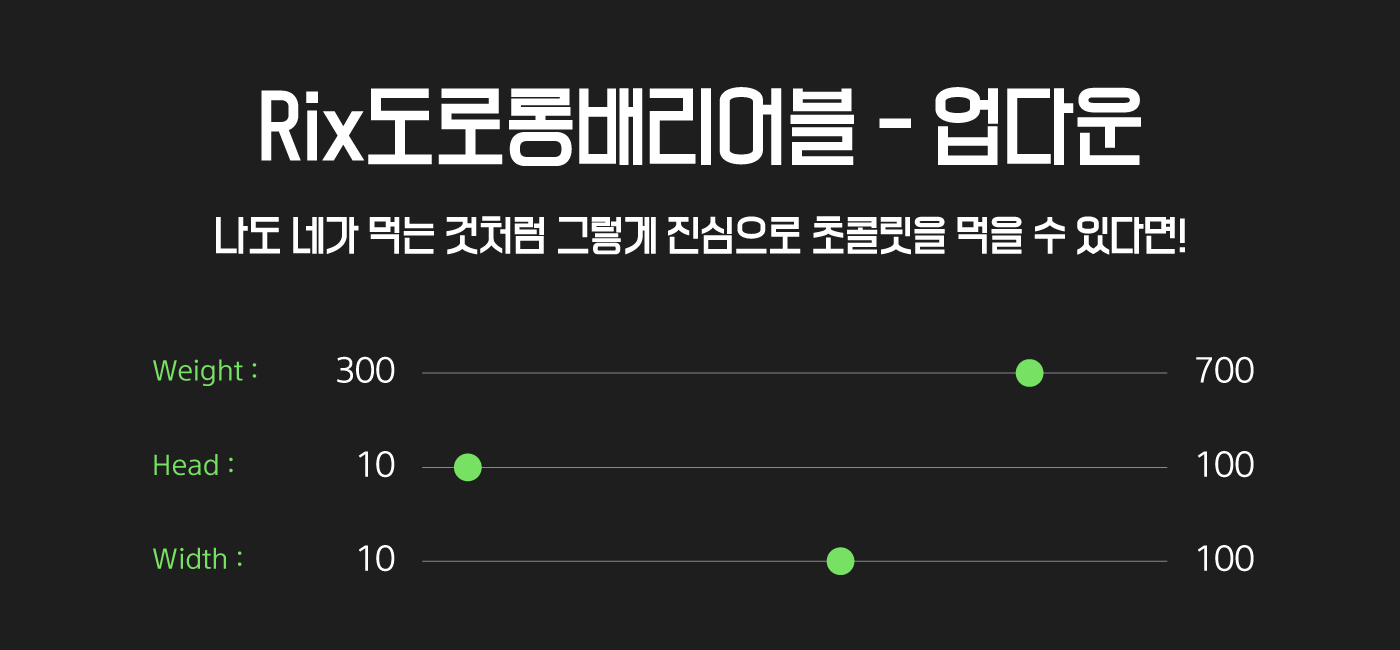 Rix도로롱배리어블 UpDown은 글자의 무게 중심을 위, 아래로 이동할 수 있습니다. 기본적으로 Rix도로롱은 좁은 폭을 가지고 처음 출시되었는데요. 배리어블 폰트로 재창조되면서 한정적이었던 글자 폭을 더 늘려서 사용할 수도 있고, 무게 중심을 통해 새로운 이미지도 구현할 수 있게 되었습니다.