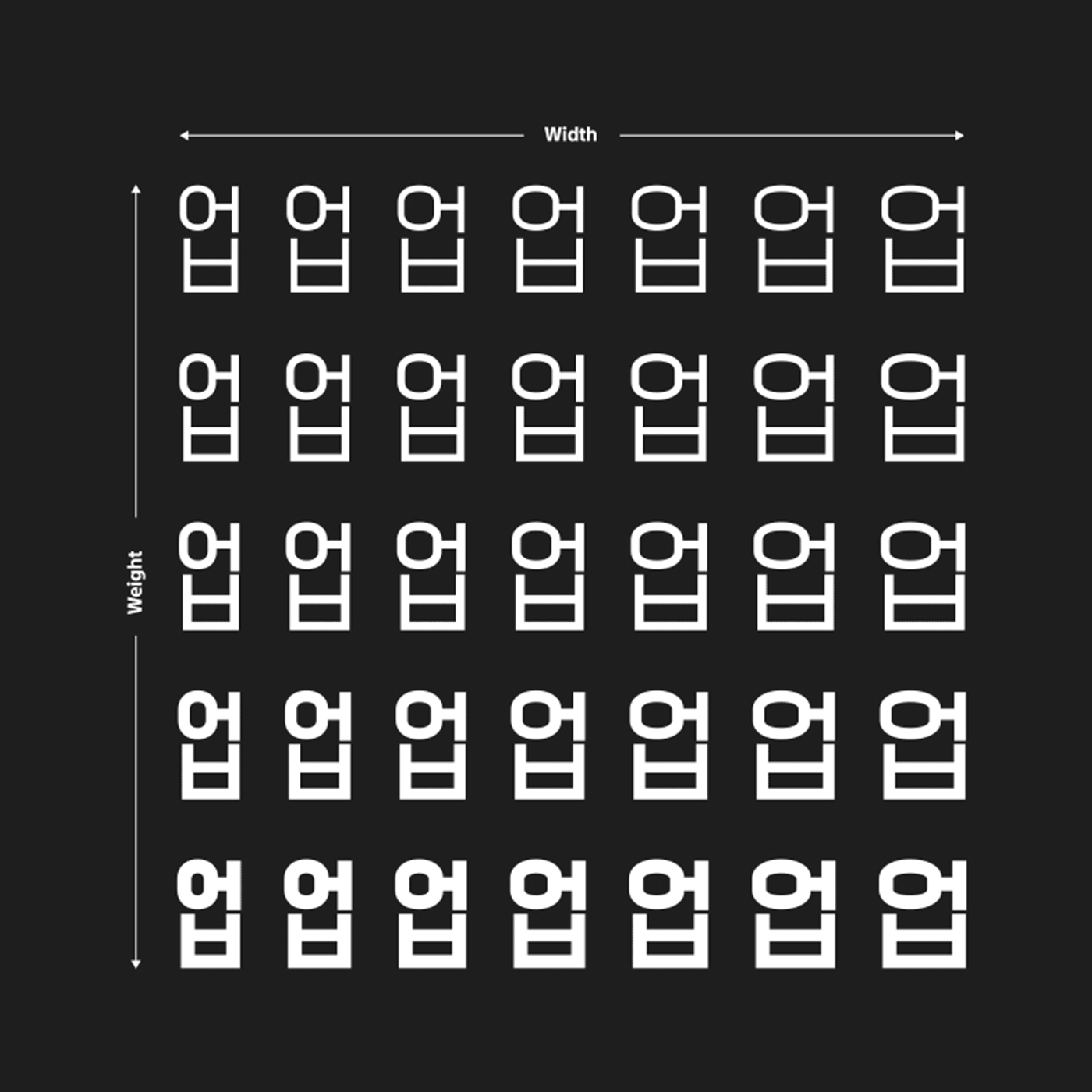 글자의 두께는 Light부터 Bold까지 무수히 많은 굵기를 세밀하게 표현할 수 있습니다. 너비 또한 아주 좁은 형태부터 넓게 조절할 수 있어 글자의 스타일와 분위기에 다양한 변주를 줄 수 있습니다.