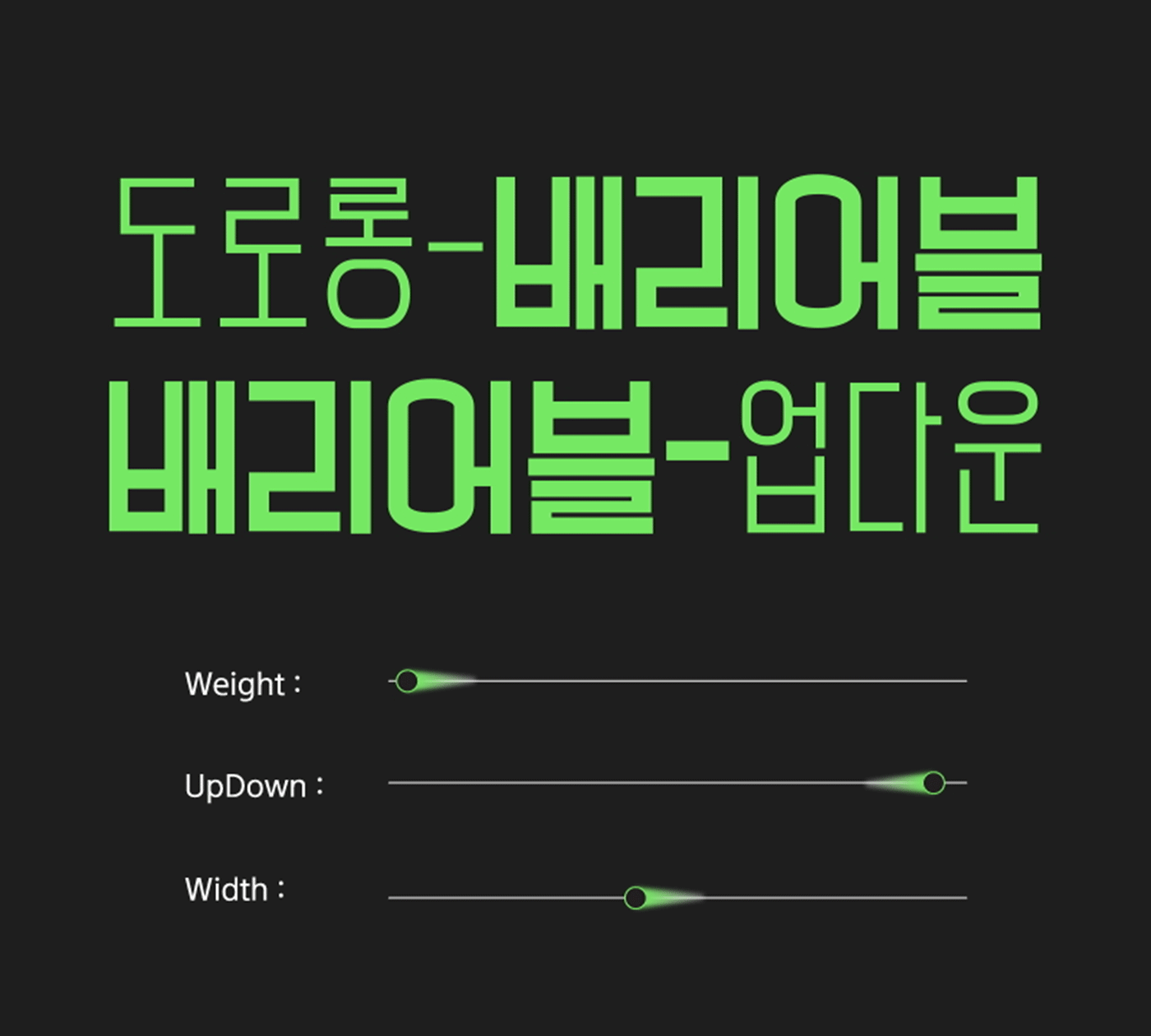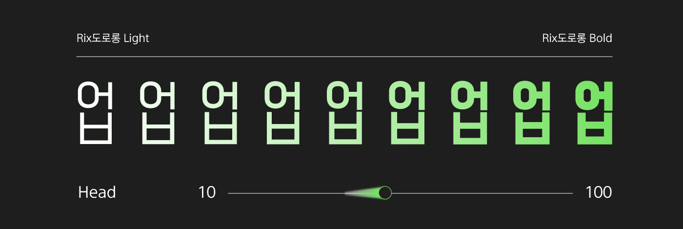 장체 스타일의 심플하고 모던한 서체 Rix도로롱을 기반으로 Weight(두께), Head(무게 중심), 그리고 Width(너비) 세 가지 축으로 구분하여 디자인했습니다. 각 축을 사용자가 이동함에 따라 폰트의 굵기와 무게 중심, 폭이 달라집니다.