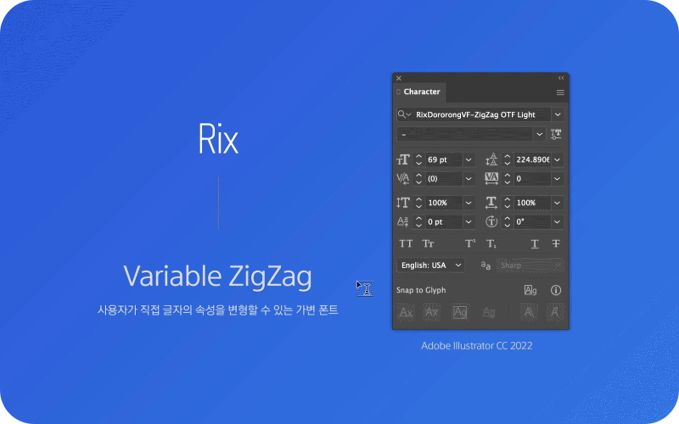 *Opentype 기능을 지원하는 어도비 프로그램(Adobe CC)에서 사용 가능하며, 확장자는 TTF로 제공되어 RixFont클라우드 TTF 탭에서만 활성화가 가능합니다.