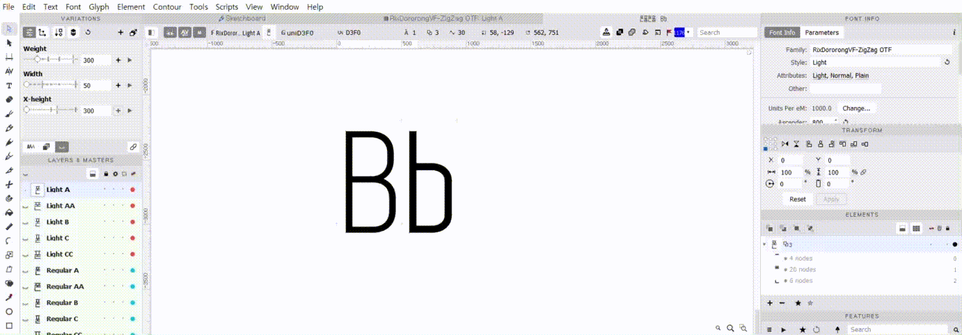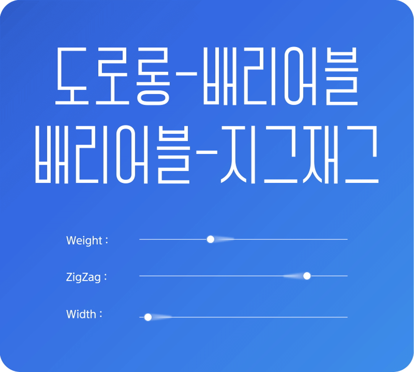 도로롱배리어블-UpDown에서 글자의 굵기, 너비, 무게 중심을 자유롭게 조정하여 설정할 수 있었는데요. Rix도로롱배리어블-ZigZag는 무게 중심에 변형을 준 배리어블 폰트입니다. 서체의 무게 중심이 앞뒤로 다르게 적용이 되며, 위아래 지그재그로 움직이는 변주를 주어 더욱 재미있는 표현이 가능해졌어요.