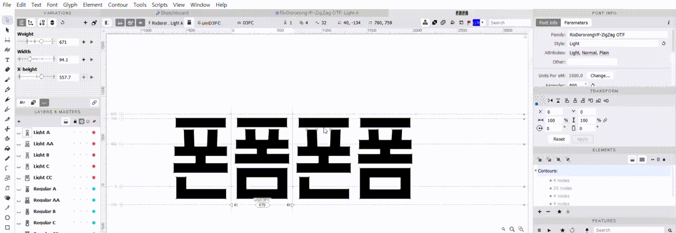 도로롱배리어블-UpDown에서 글자의 굵기, 너비, 무게 중심을 자유롭게 조정하여 설정할 수 있었는데요. Rix도로롱배리어블-ZigZag는 무게 중심에 변형을 준 배리어블 폰트입니다. 서체의 무게 중심이 앞뒤로 다르게 적용이 되며, 위아래 지그재그로 움직이는 변주를 주어 더욱 재미있는 표현이 가능해졌어요.