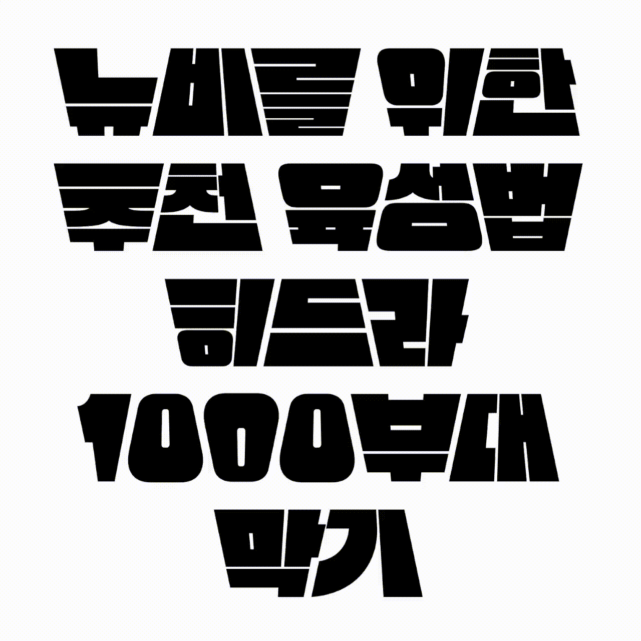 네모 틀에 꽉꽉 들어찬 아주 무거운 폰트이기 때문에 단어 단위 짧은 호흡의 제목 용도로 유용할 것 같아요. 빠르게 지나가게 되는 동영상 썸네일 등의 맥락에서도 번갈아 바뀌는 기울기의 리듬감이 사람들의 시선을 확! 잡아 끌 수 있지 않을까 생각합니다.