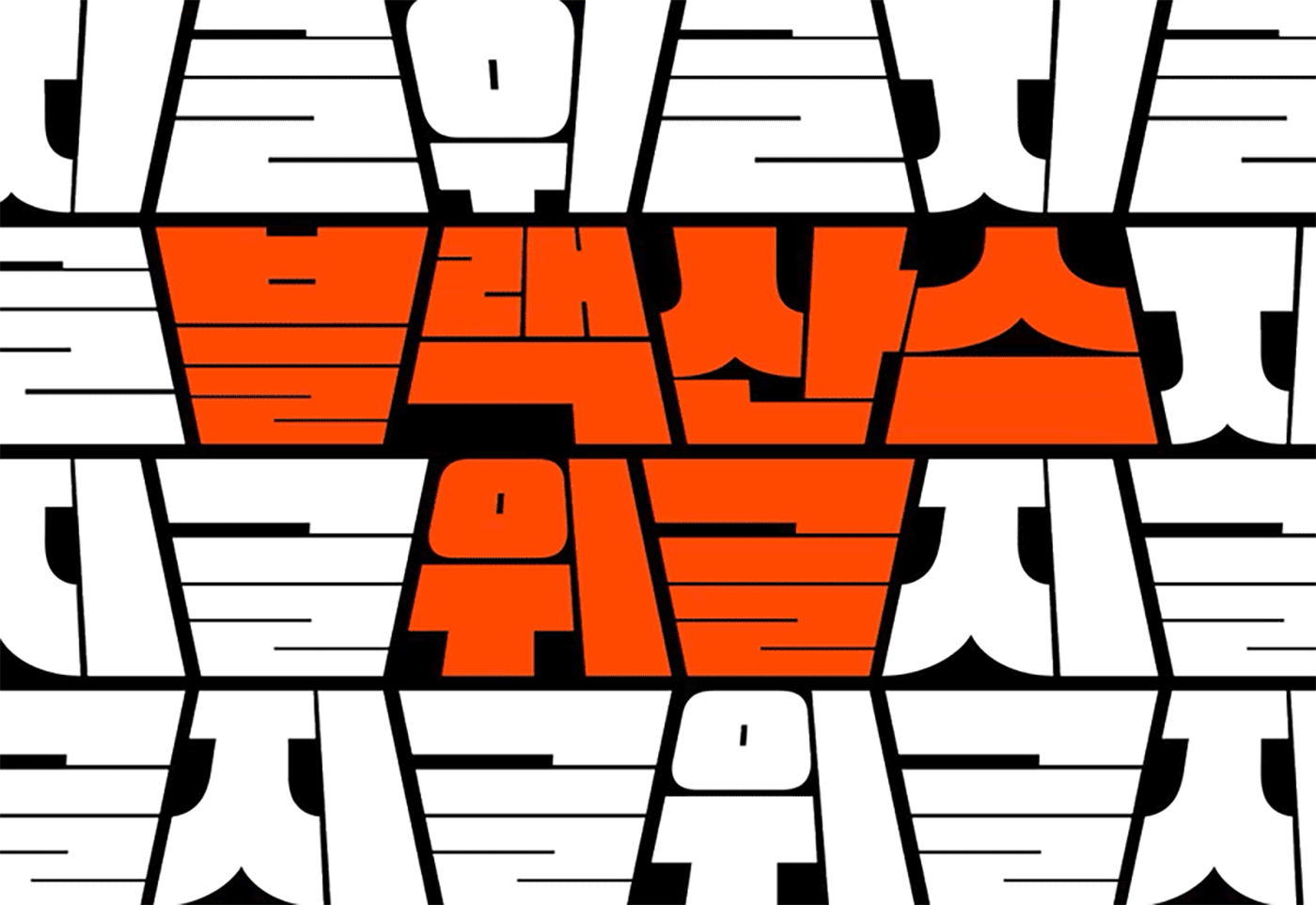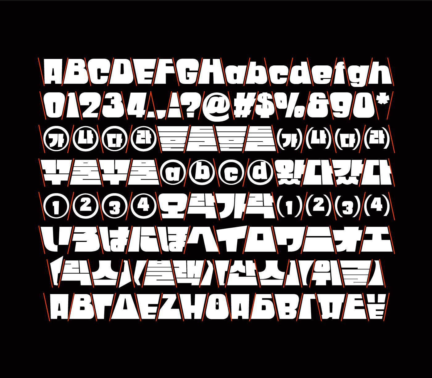 두꺼운 웨이트가 특징인 블랙산스에게는 아주 큰 변화라고 할 수 있을 것 같아요. 글자의 형태가 네모틀을 벗어나 사다리꼴로 변형이 일어나고 또 앞뒤로 번갈아가며 효과가 적용됩니다.