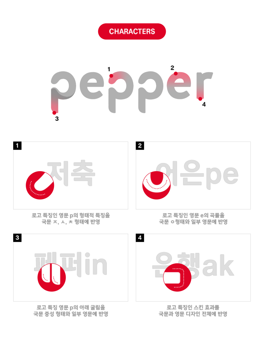 페퍼그룹의 CI 디자인에서 부드럽고 독창적인 형태 디자인을 볼 수 있는데요, 이러한 혁신적이고 신선한 인상을 전용서체에 그대로 녹이되 동시에 활용성을 높이고자 디자인적인 디테일을 더했습니다.