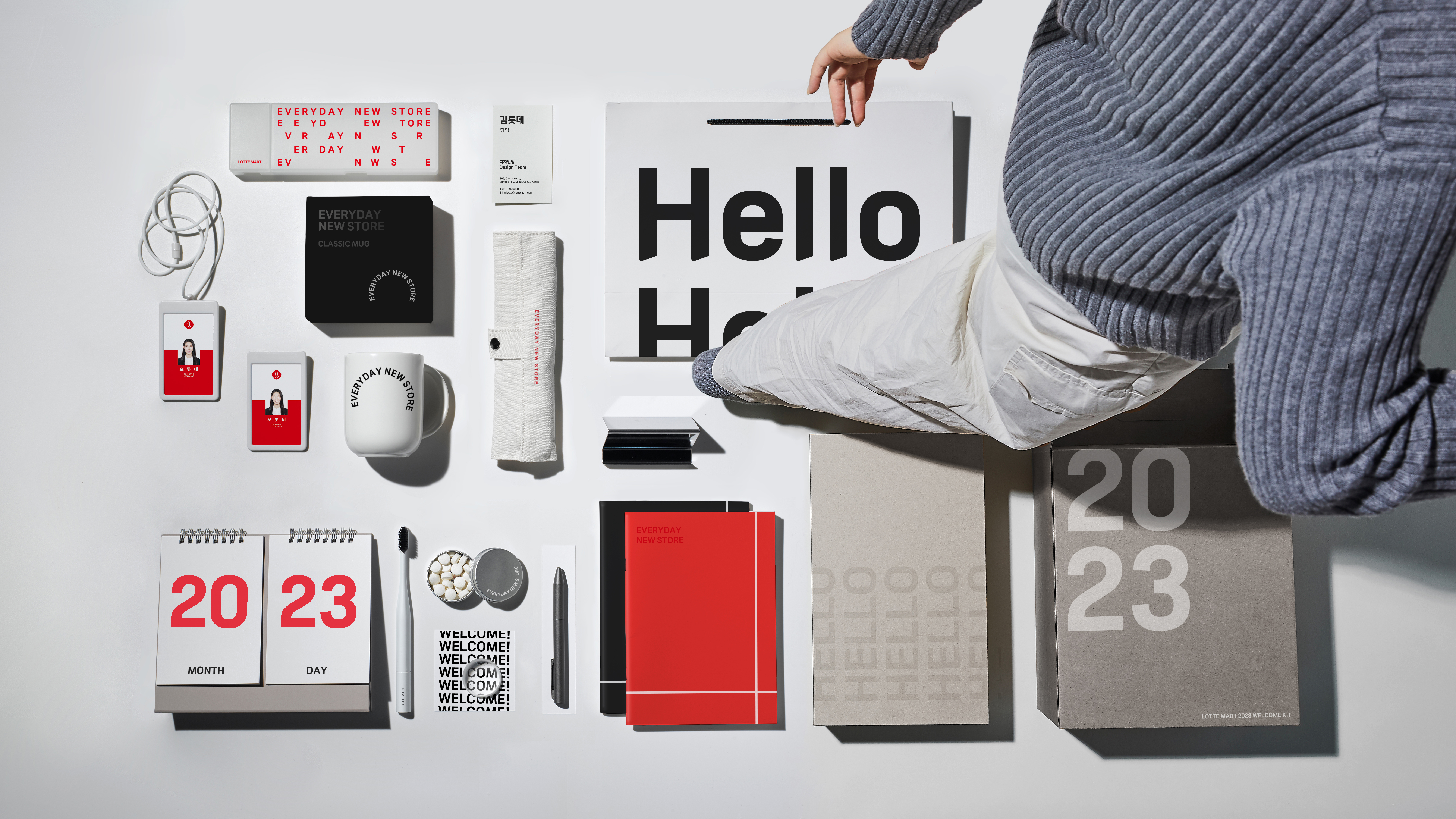 롯데마트의 새로운 비전인 'Everyday New Store'에 걸맞은 젊고 신선한 이미지를 주기 위해 적은 획대비(굵기의 비례)와 수직/수평적인 획, 대각선 등의 도식적인 형태를 넣어 깔끔하고 모던한 디자인으로 제작했습니다.