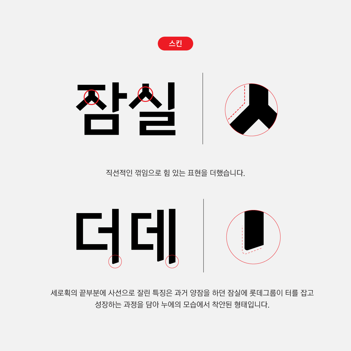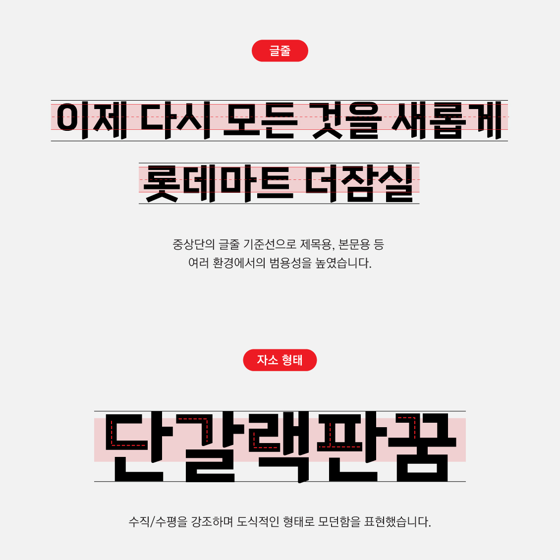 더잠실체 한글은 안정적이고 단단한 고딕 모듈로 설계되었습니다. 롯데마트의 특성상 매장 내 홍보물, 각종 인쇄물과 인터넷 홈페이지, 모바일 앱 등 다양한 곳에 활용될 것을 고려하여 가독성과 범용성을 중요하게 생각했습니다. 총 6가지 굵기로 파생되어 제목과 본문에 적절하게 사용할 수 있습니다.