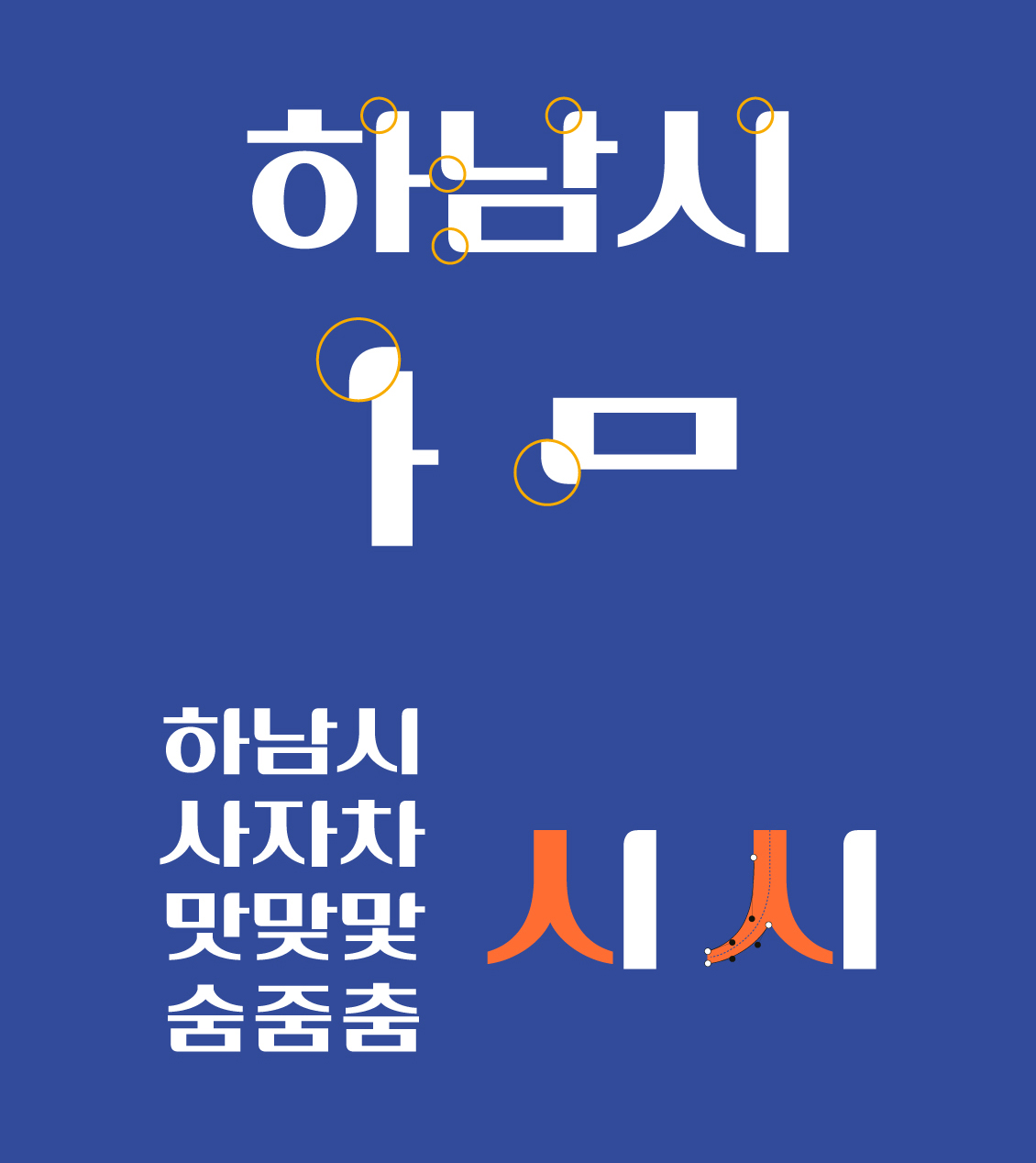 두꺼운 세로 획의 좌 상단과 일부 꺾임 부분에 기존 로고타입에서 볼 수 있는 굴림 효과를 일정하게 넣어 하남시의 정체성을 유지하면서 안정감 있고 부드러운 인상이 느껴지도록 했습니다. ‘ㅅ’, ‘ㅆ’, ‘ㅈ’, ‘ㅉ’, ‘ㅊ’ 등 ‘ㅅ’계 자소에 여유로운 곡선은 온화하고 풍요로운 느낌을 줍니다.