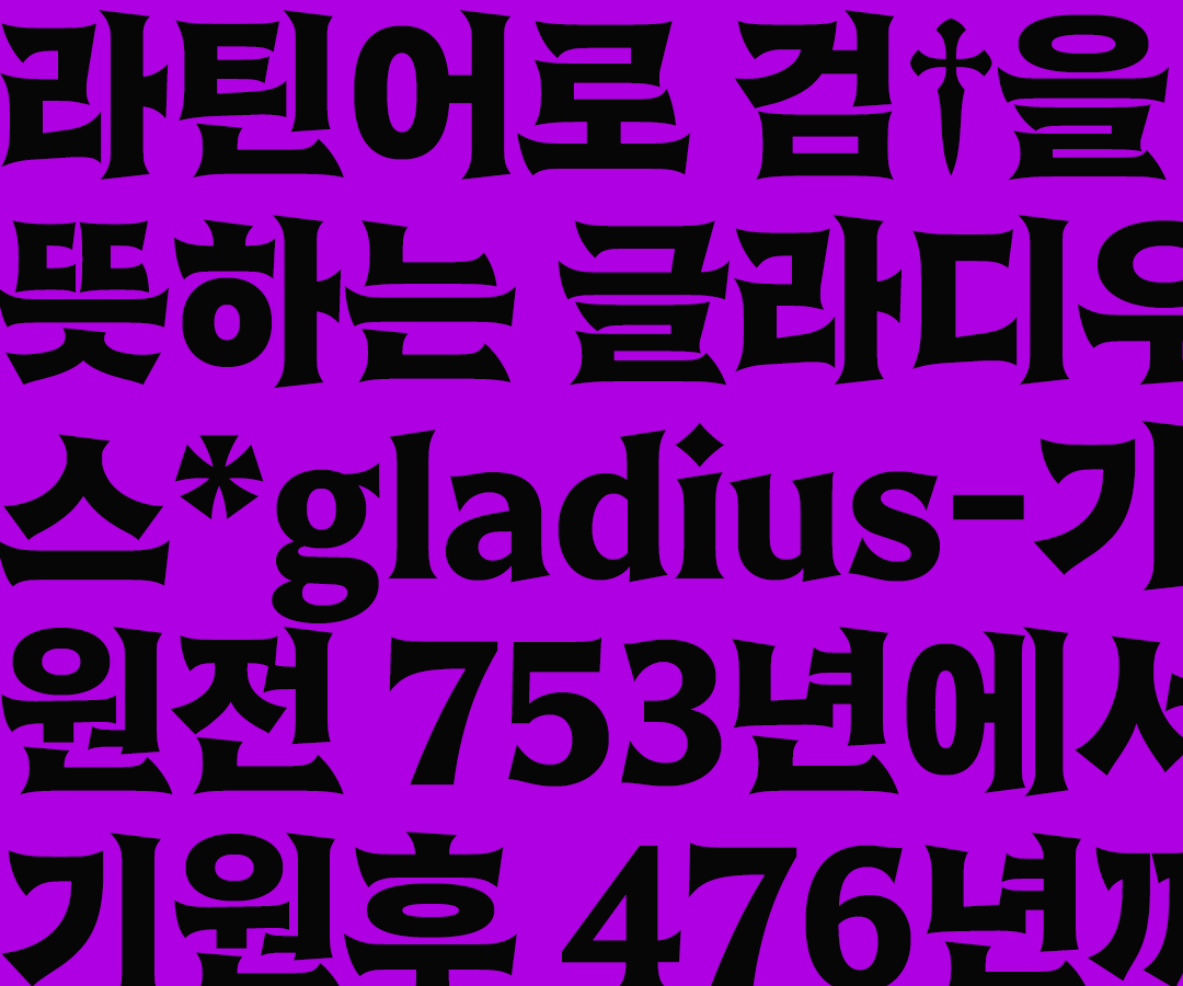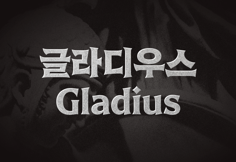 Rix글라디우스는 트라야누스 비문 글자와 같은 로마 명각 글자에서 영감을 받아서 시작한 작업입니다. 한글에 맞춰 구조는 조금 달라졌지만, 글리픽 스타일* 대문자의 플레어 세리프와 넓고 시원시원하게 뻗은 골격 등을 참고해 서체를 제작하게 되었습니다. 날카롭고 단단한 미감의 특징을 살려, 로마 제국 시절 군인들이 쓰던 검의 이름을 따 글라디우스라는 이름을 붙이게 되었답니다. 이름에 맞춰, 대거 †(0x2020) 글립의 대체 형태로 글라디우스 모양을 추가했답니다.