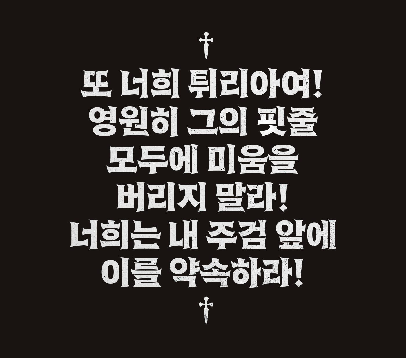 전각에 꽉 들어찬 공격적인 얼굴을 가지고 있는 서체라서, 강렬한 메시지를 전달하길 원하실 때 사용하기 좋을 것 같아요. 고대~중세 전쟁 배경의 판타지 게임이나 소설 등의 타이틀에 사용하시면 어떨까 싶습니다.