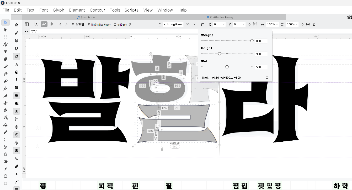 뾰족하게 뻗는 획 끝을 특징으로 하다 보니 자소의 디테일을 살리며 공간을 분배하기가 어려웠습니다. 쌍시옷, 쌍지읒의 내리점과 삐침이 가운데 만나는 지점 등이 골치 아프더라고요. 시간을 많이 쏟았답니다!😂 또한 이번 작업에는 폰트랩 8의 스마트 배리어블 컴포넌트 기능을 사용했어요. 설정한 축에 따라 폰트의 외형을 변경할 수 있는 배리어블 폰트와 같이 글립 하나하나마다 축을 설정해 컴포넌트로 불러왔을 때 모양을 바꿀 수 있는 기능인데요, 비슷한 꼴 글립의 자소 디자인이 일관성을 가지게 하기 위해 도움을 많이 받았습니다.