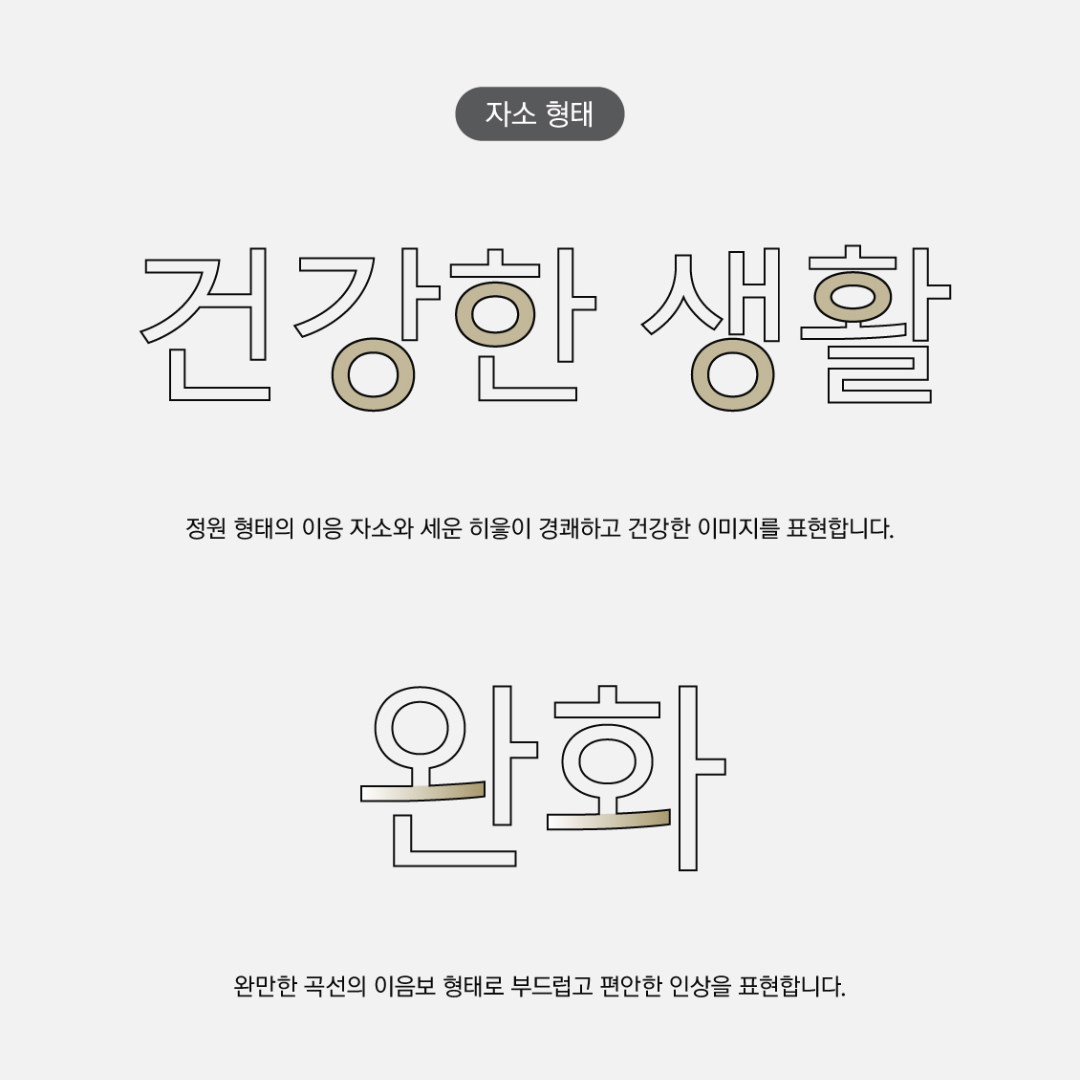 이를 개선하여 부드러운 인상을 줄 수 있는 정도의 하단부 쪽 곡선과 정원형의 이응꼴 형태는 유지하고, 대부분의 굴림을 삭제해 훨씬 깔끔하고 경쾌한 인상을 주었습니다.