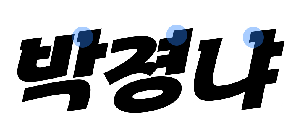 가로 세로로 기울기가 심한 폰트를 제작하는 게 처음이라 아쉬운 부분들이 있는데, 반대로 생각하면 그 기울기가 강점인 것 같아요. 빠른 획순의 디자인과 만나 더 힘 있고 역동적으로 느껴집니다.