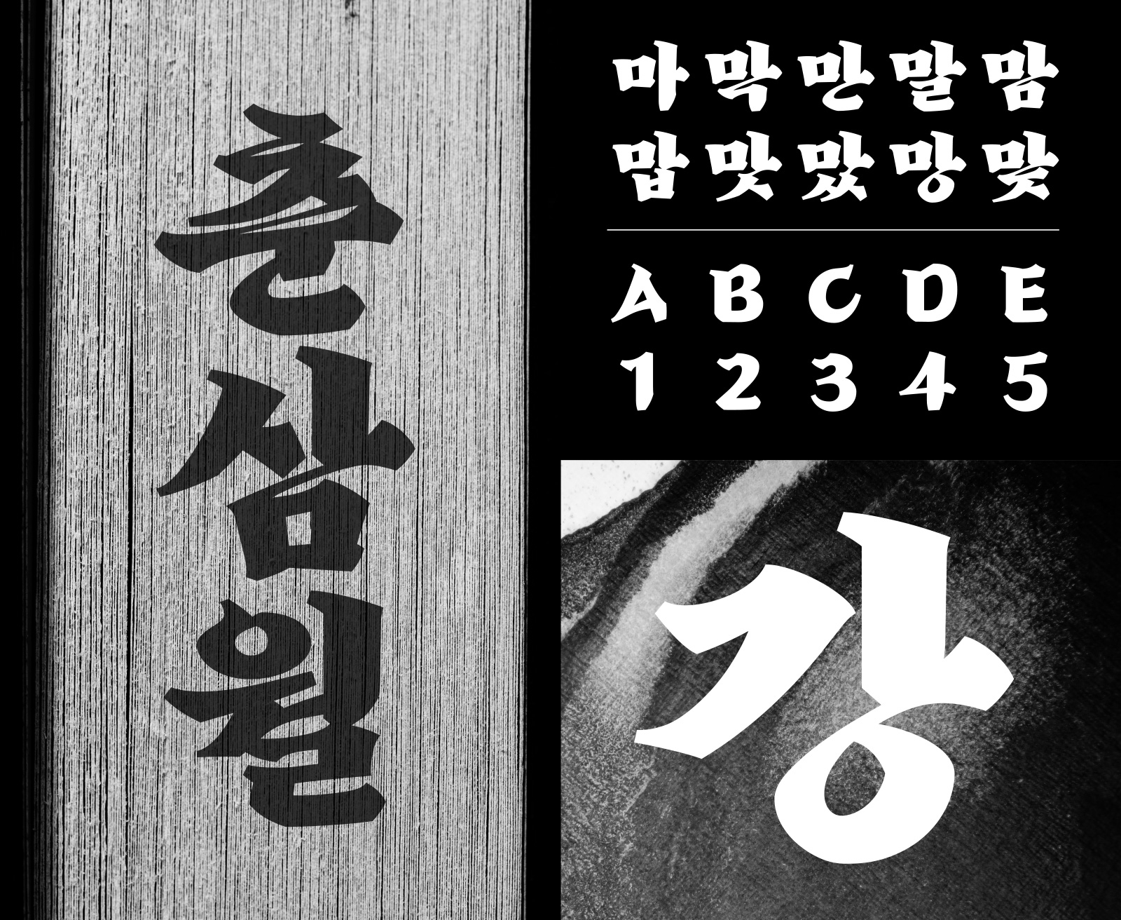 Super Size급 무게감은 짧고 강한 메시지 전달에 적합하며, 디지털 환경에서도 붓과 먹의 질감을 선명하게 표현할 수 있도록 설계했습니다. 전통적인 붓글씨의 올드함을 현대적으로 재해석해 시선을 압도하는 강인함과 명확한 인상을 줄 수 있어서 광고, 옥외 간판, 스크린, 지면, 타이틀에 사용을 추천합니다.