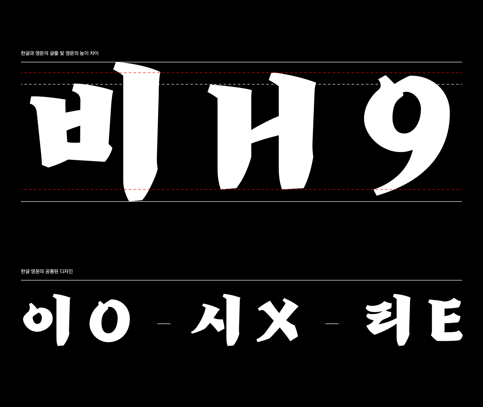 영문과 숫자에도 한글과 동일한 필획 중심의 구조를 적용하였으며, 한글 가로쓰기 구조에서의 특징인 사다리꼴 형태에 맞춰 영문도 디자인했습니다.
