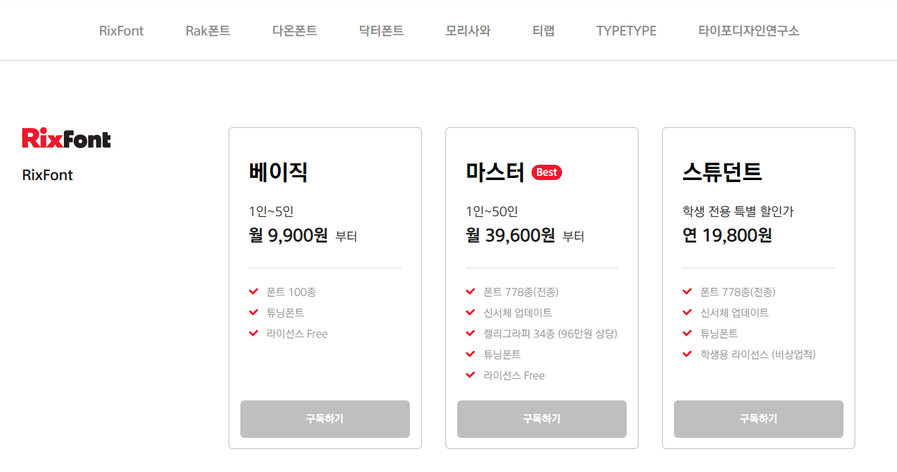 RixFont(릭스폰트)는 700여 종의 폰트를 월 39,600원으로 자유롭게 사용할 수 있으며, 가장 많이 사용되는 100종을 엄선한 베이직 상품은 월 9,900원으로 사용할 수 있습니다.