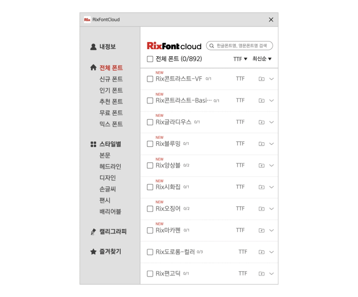 RixFont클라우드 앱을 다운로드 받아 PC에 설치하고 로그인 하면 클라우드 앱을 통해서 폰트검색, 즐겨찾기를 할 수 있고, 원하는 폰트만 선택해 활성화 하면 모든 프로그램에서 사용이 가능합니다.