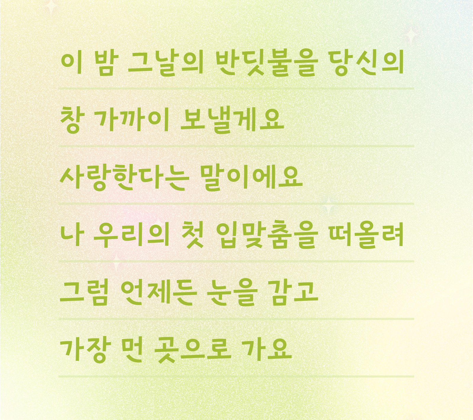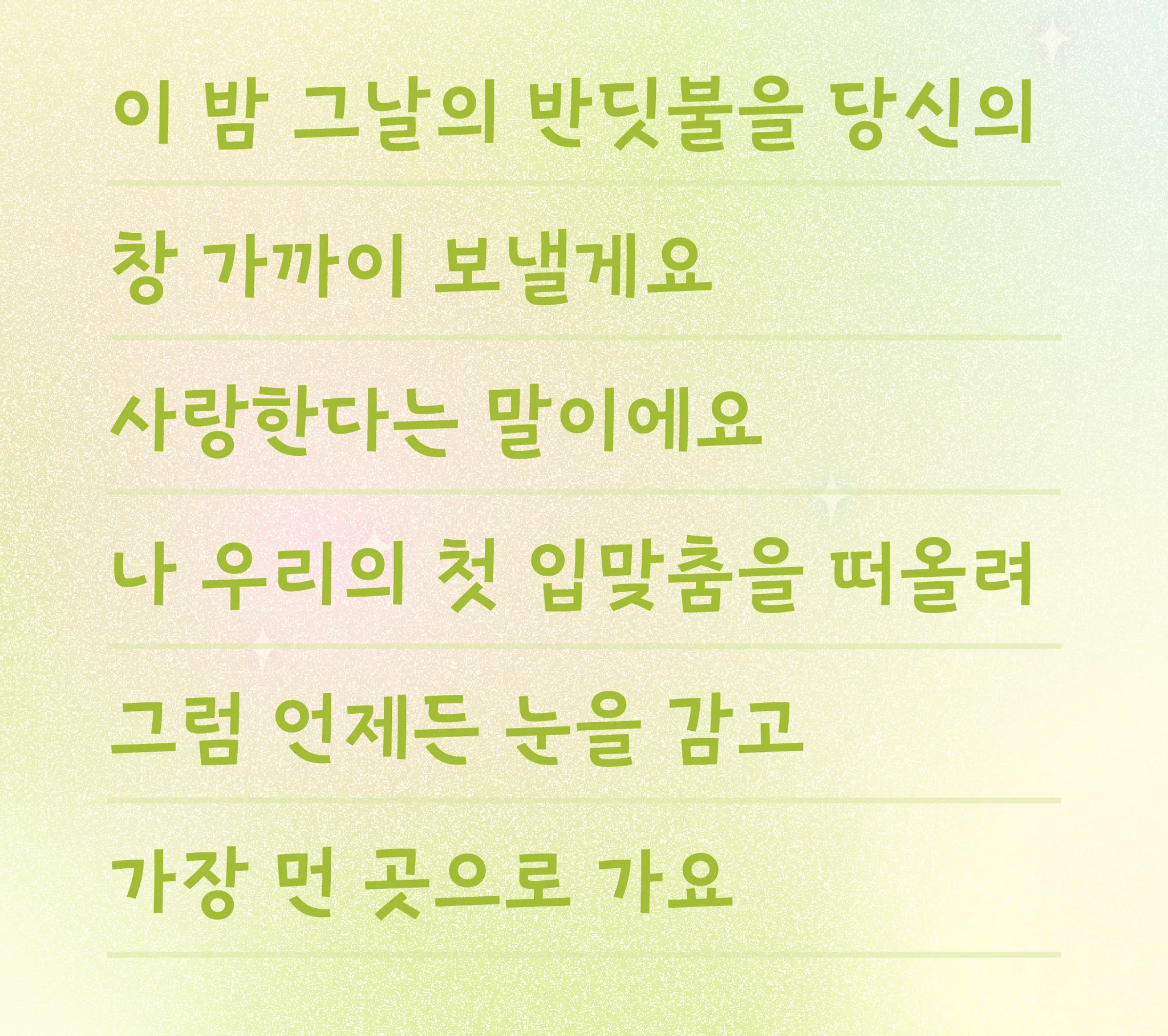 감성적인 순간을 자연스럽게 담아내는 손글씨의 분위기를 바탕으로, 은은하게 빛나는 반딧불이에서 영감을 받아 따뜻하고 부드러운 감성을 전달하고자 했습니다.