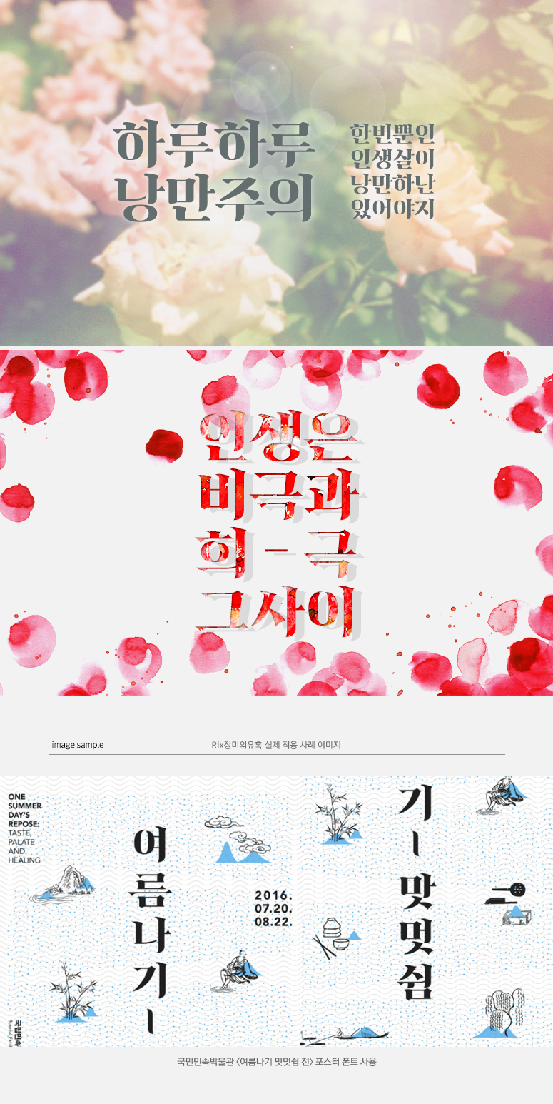 Rix장미의유혹은 장미의 봉우리 특징을 담은 획의 대비가 큰 복고적인 느낌의 폰트입니다.