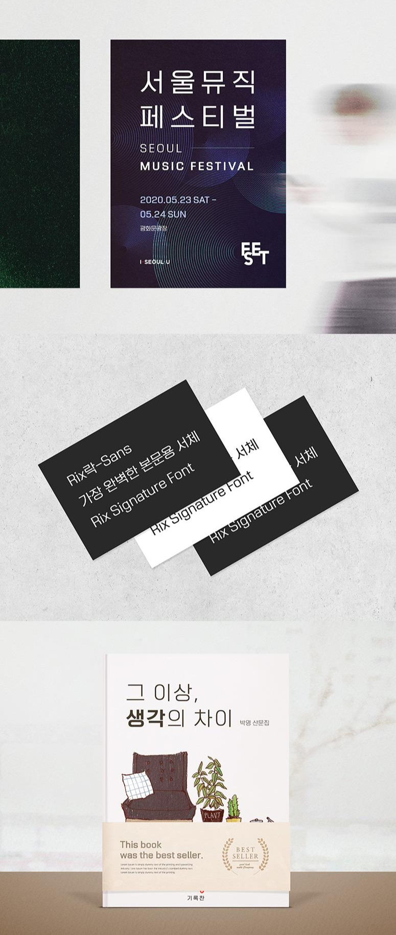 Rix락-Sans는 네모 꽉 찬 글자틀과 세련된 형태로 정갈하고 모던합니다. 일반적인 디자인의 자소로 담백하고 군더더기 없는 형태의 서체입니다. 어디에나 쉽게 적용할 수 있도록 총 9가지의 굵기 제공으로 다양한 니즈를 충족합니다.