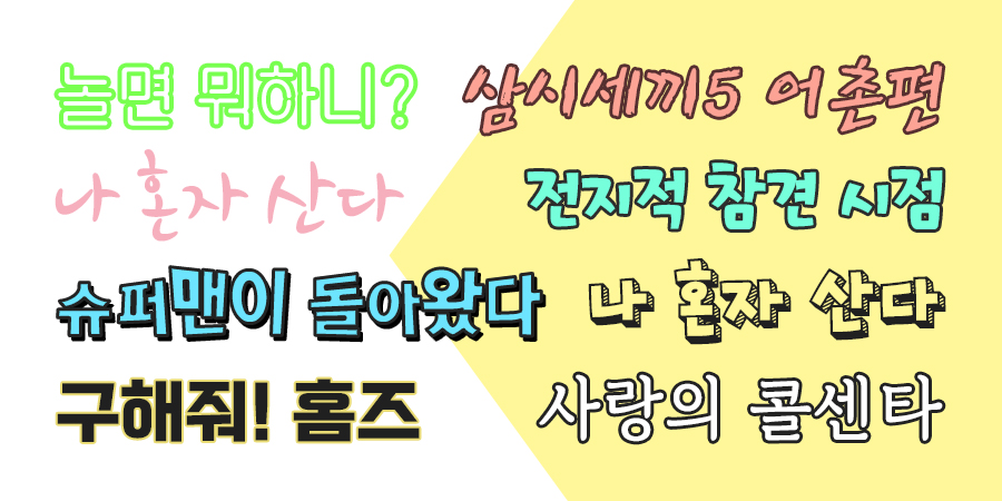 장난스러운 상황이나 재밌는 상황이 연출될 때 주로 사용되는 Rix토이그레이 폰트! 자유로운 글줄로 귀엽고도 발랄한 느낌을 주는 특징이 있어 각종 예능 프로그램에 자주 등장해요. 흥미로운 사건들이 쉴 새 없이 터지는 예능에 아주 적합한 폰트라고 할 수 있겠죠.