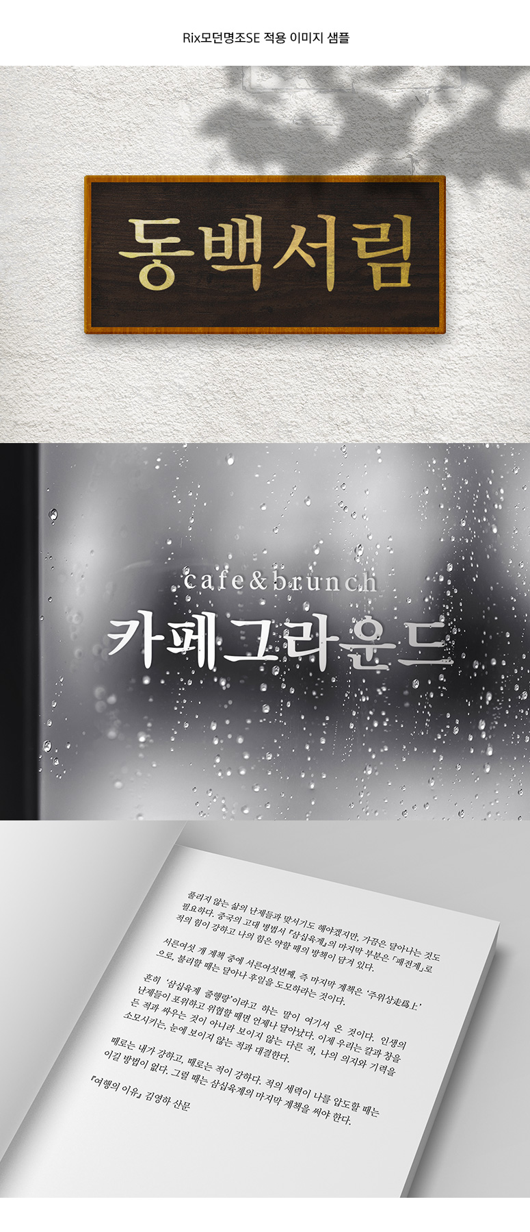 Rix모던명조SE는 현대적 클래식함이 느껴지는 폰트입니다. 모던하고 세련된 느낌을 담은 대표적인 명조체입니다.