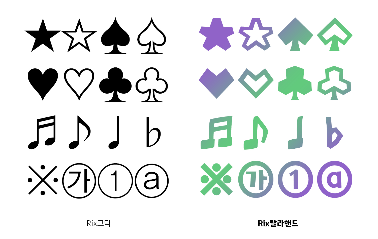 어떤 부분이 다른지 확실히 비교해드리고자 베이직한 본문형 서체로 잘 알려진 'Rix고딕'과 비교해 보았는데요. 가위로 잘라 만든 글씨처럼 특수문자에도 적용된 랄라핸드 스타일. 특히 음표들 표현된 게 참 귀엽고 사랑스럽더라고요ღ'ᴗ'ღ