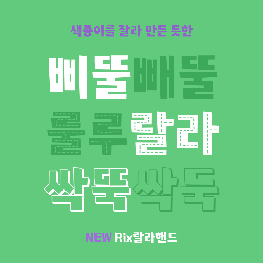 'Rix랄라핸드'는 Cutting, Stitch, Craft 3종으로 이루어진 폰트입니다. Cutting을 기본형으로, 다이어리 꾸밀 때 한 번쯤 해 보았던 드로잉(낙서) 참고하여 Stitch, Craft 효과를 만들었습니다. 형태적으로 삐뚤빼뚤, 자소 비대칭 형태가 매력적이라고 생각합니다. 효과가 들어간 Stitch, Craft 같은 경우에는 18pt이상으로 사용했을 때 디테일이 살아 더 예쁘게 사용 가능합니다. 효과와 효과를 오버랩하여 그래픽적으로 다양하게 사용할 수 있는 점이 매력포인트 같습니다.