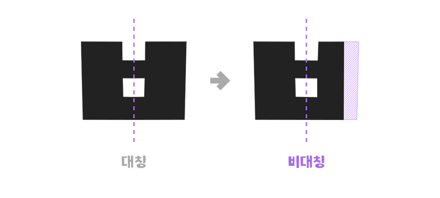 먼저 '랄라핸드'라는 이름을 갖게 된 이유, 삐뚤빼뚤 색종이를 잘라 만든 느낌을 살리기 위해 자소(낱글자)를 비대칭으로 디자인했다는 점! 위에 보시다시피 'ㅂ'은 양쪽이 대칭적인 구조를 가진 자소인데 랄라핸드는 왼쪽과 오른쪽 굵기가 다르도록 비대칭적으로 디자인되었죠.