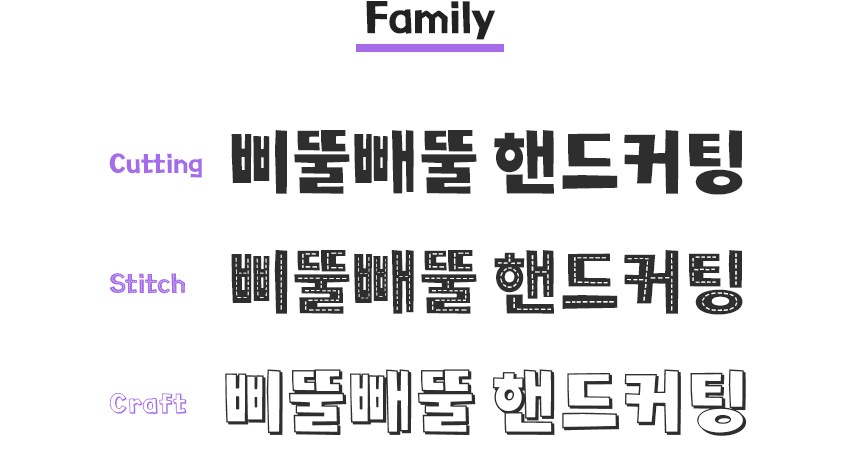 위에 잠깐 언급했던 대로 「Rix랄라 핸드」의 패밀리는 총 3가지가 있습니다. Cutting/ Stitch/ Craft 이렇게 3종으로 이루어진 폰트인데 기본 스타일의 Cutting부터 효과를 넣은 Stitch, Craft 모두 각각의 개성이 다르고 쓰임새도 달라서 쓰는 재미가 있어요. Cutting은 폰트 자체의 특징인 들쑥날쑥한 두께와 자유분방함을 잘 보여주고, Craft는 좀 더 가볍고 애니메이션 같은 느낌을 주죠. 그리고 Stitch의 매력은 밑에 계속.. 개인취향에 의해 좀 더 딥하게 파헤쳐봅니다.