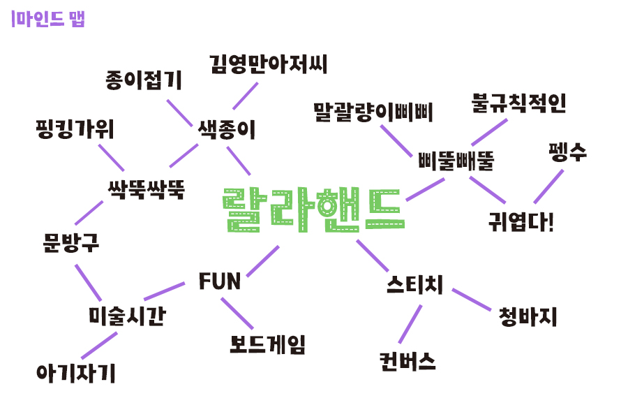 「랄라 핸드」라는 폰트명이 다소 생소할 수 있는데요, 이 이름은 신나고 기쁠 때 노래하는 표현인 '룰루랄라'의 랄라와 손으로 잘라서 만든 것을 뜻하는 '핸드컷팅(Hand Cutting)'의 핸드를 합쳐 만든 말입니다. 마인드 맵에서 보이듯 다양하고 재미있는 표현과 단어들이 떠올랐던 아이에요.