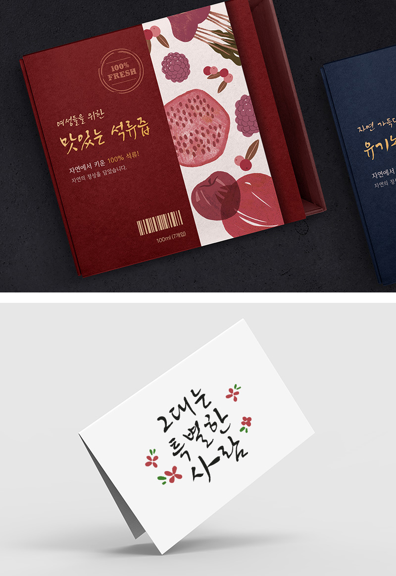 제품 패키지나 카드, 배너 포스터, 택 디자인 등에 사용해본 샘플입니다. 아무래도 한국적인 분위기가 나는 붓글씨 서체라 그런지 민족 고유의 명절 추석의 이미지와 자연스럽게 잘 어우러집니다. 또한 세련되고 고급스러운 패키지에도 잘 어울리죠. 컬러나 일러스트와의 조합에 따라 다양한 디자인에 적용할 수 있어요.